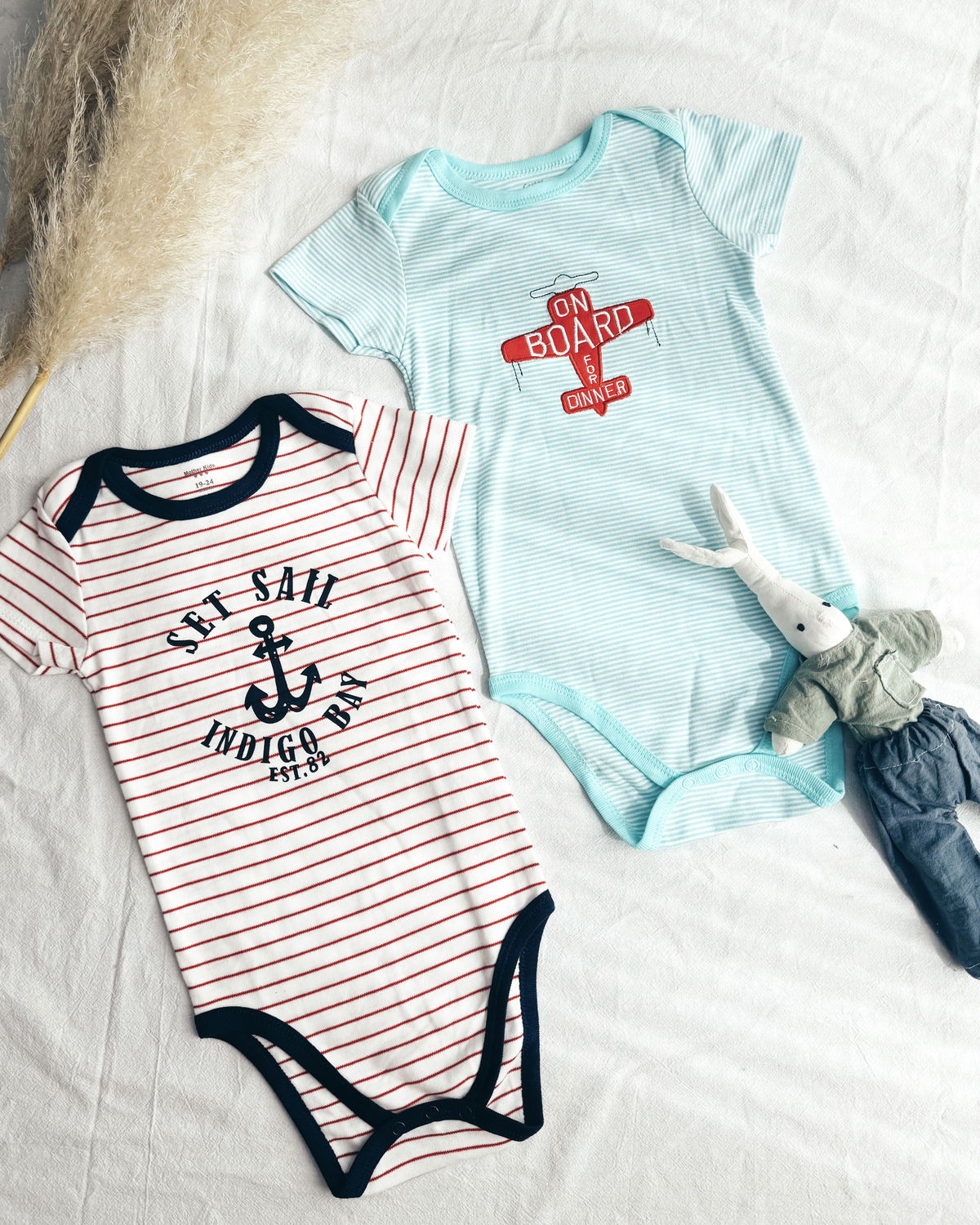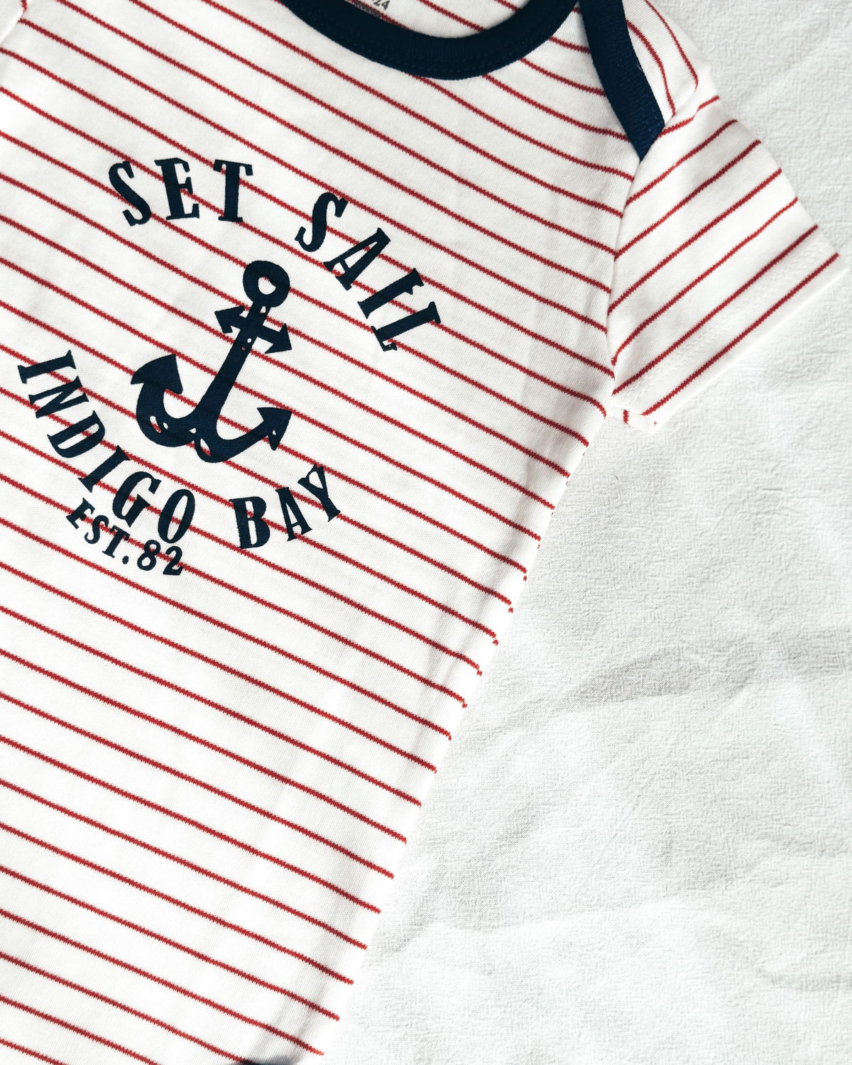 Body m/c blanco con rayas rojas y detalles y estampado en azul oscuro, este modelo viene con 2 broches a presión en la parte inferior.