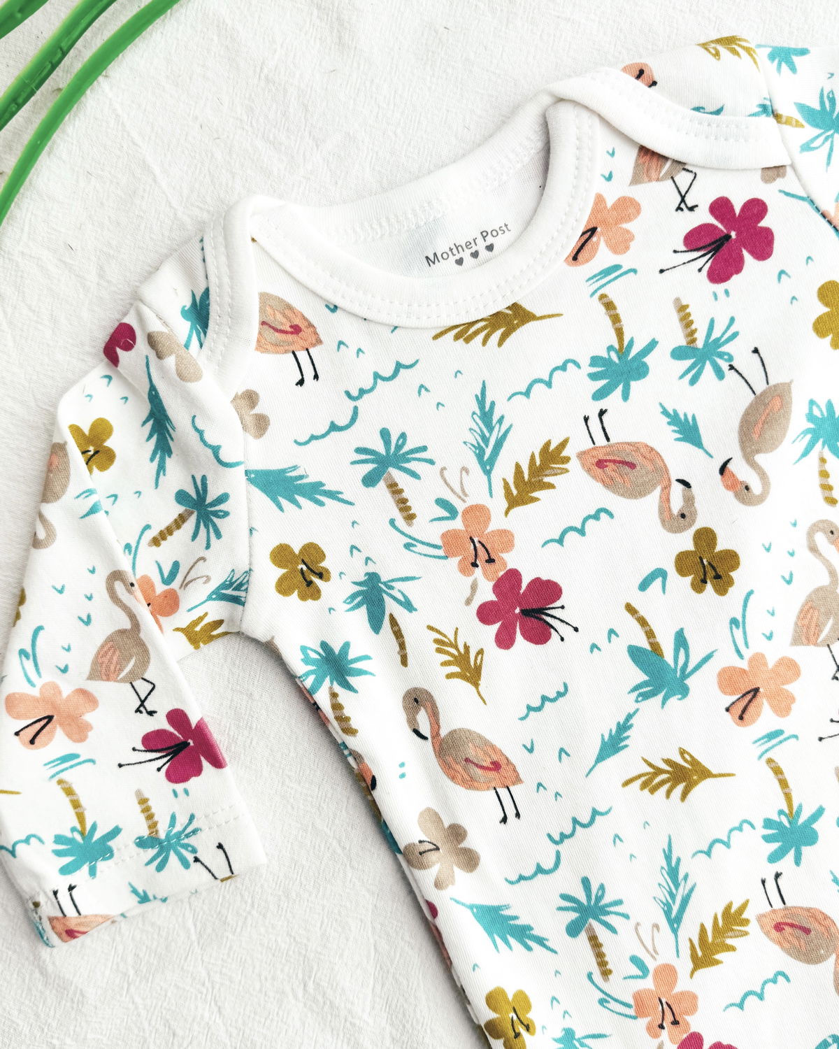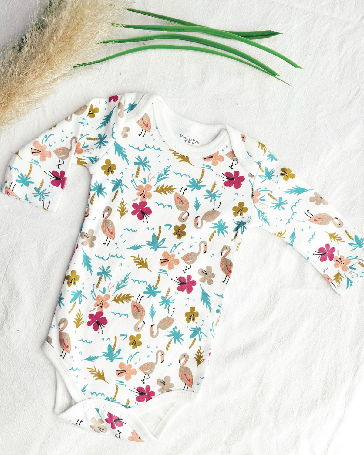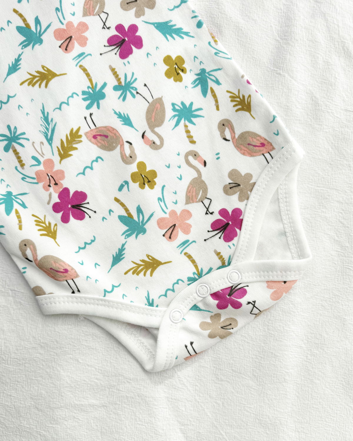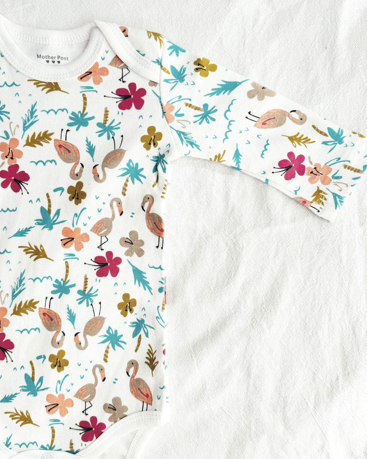Body m/l flamenco en tono blanco con estampado de flamencos, flores y palmeras.
