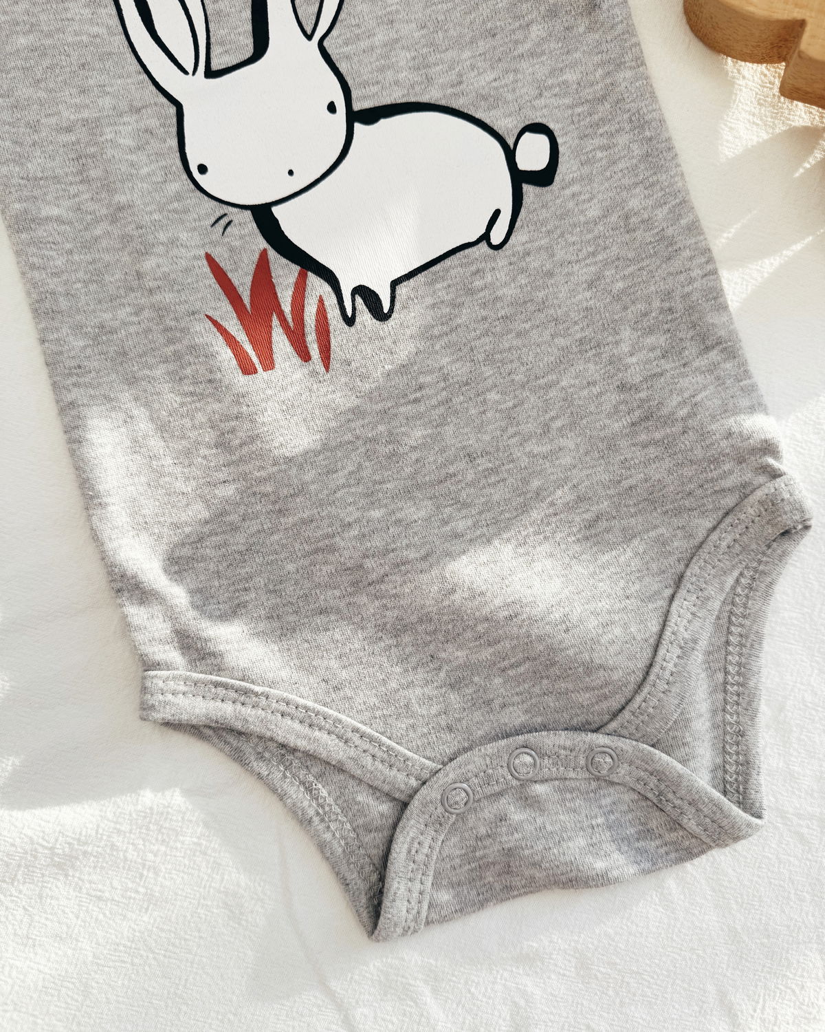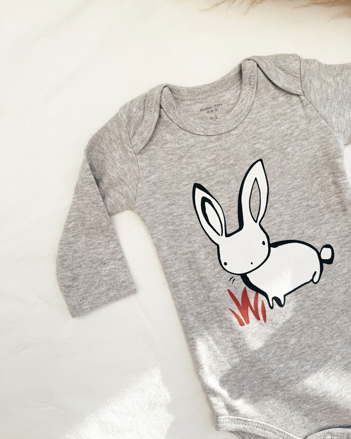 Body m/l en tono gris gaspeado, con un estampado de conejito blanco. Este modelo es 100% de algodón lo que permite que sus movimientos sean totalmente cómodos.