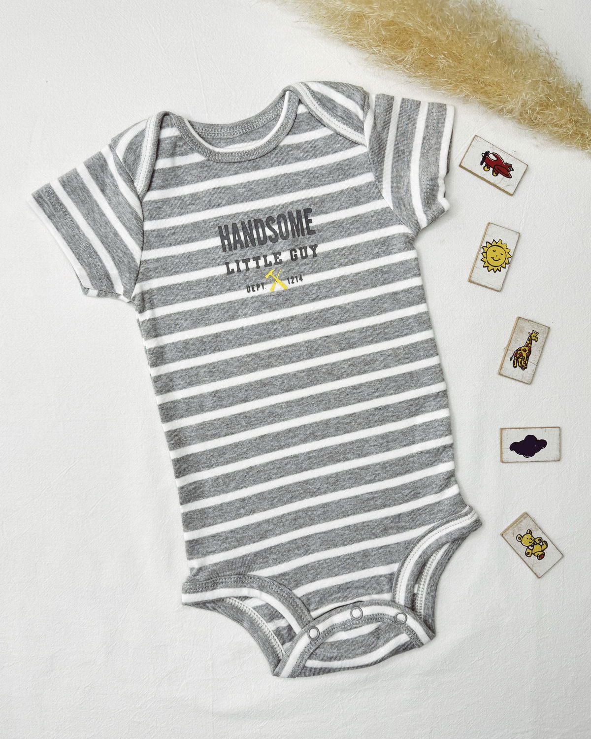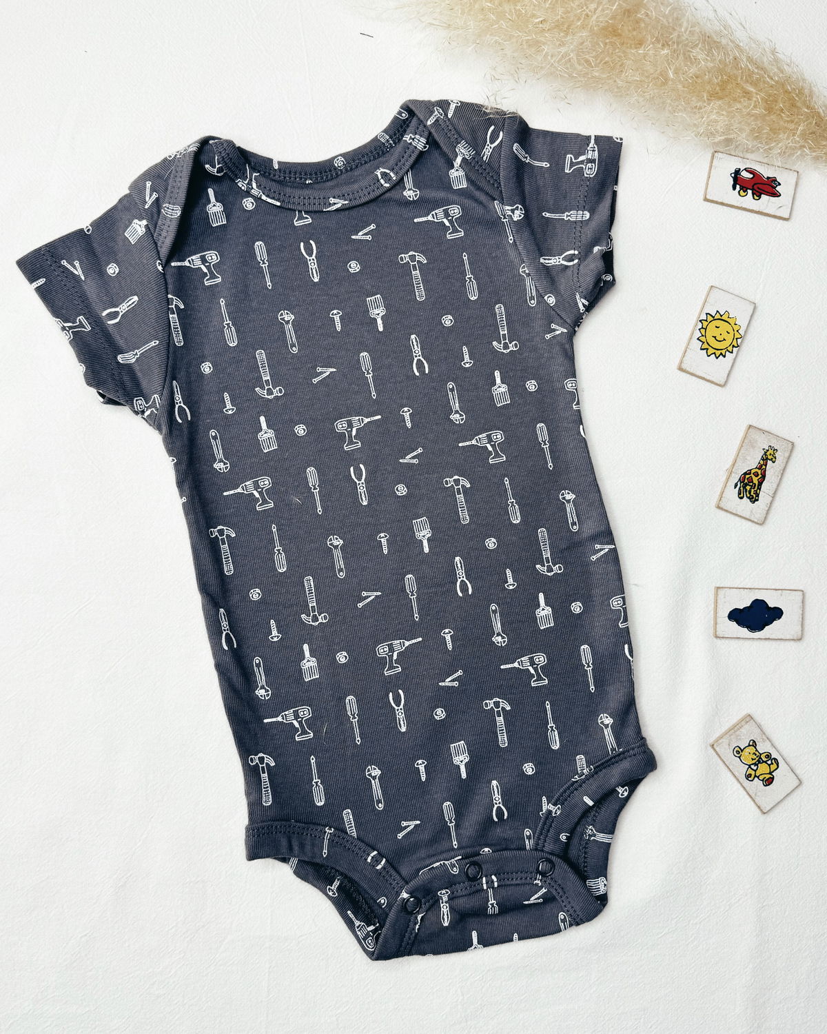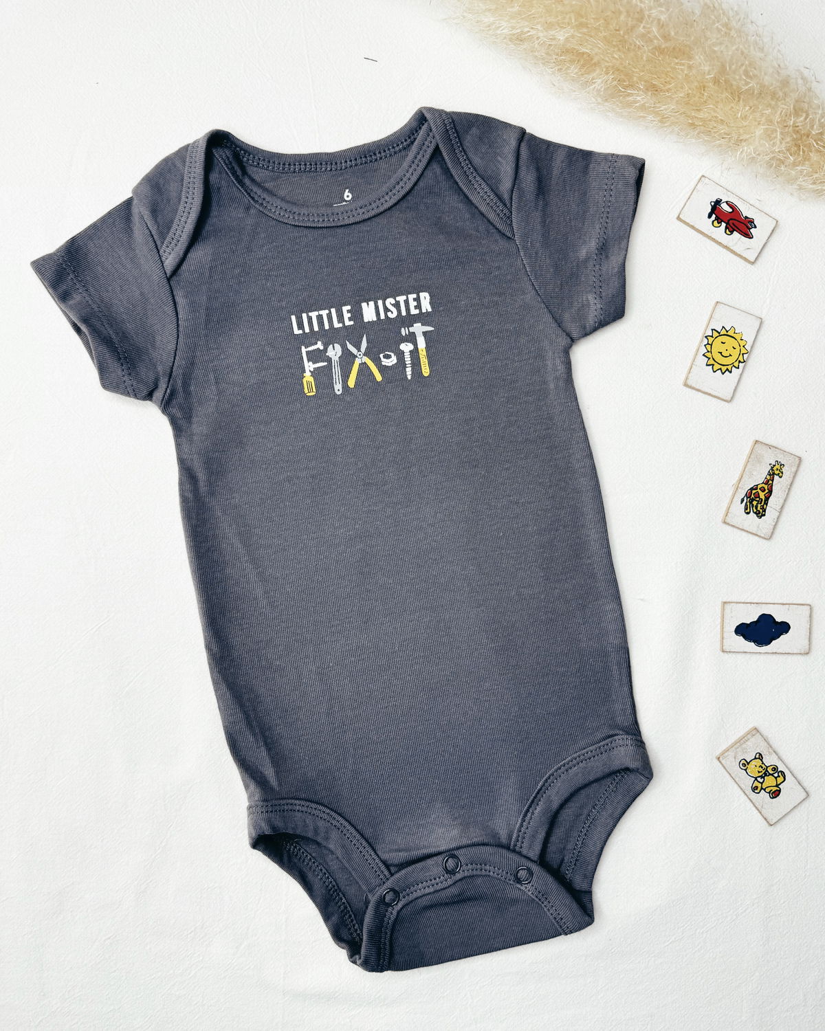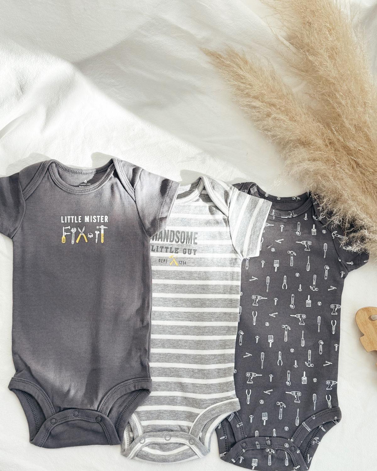 Pack x 3 bodies en m/c , uno en tono gris oscuro con estampado de herramientas Little Mister, un segundo en monograma de herramientas y el último modelo rayadito en gris claro con blanco y estampado en gris oscuro.