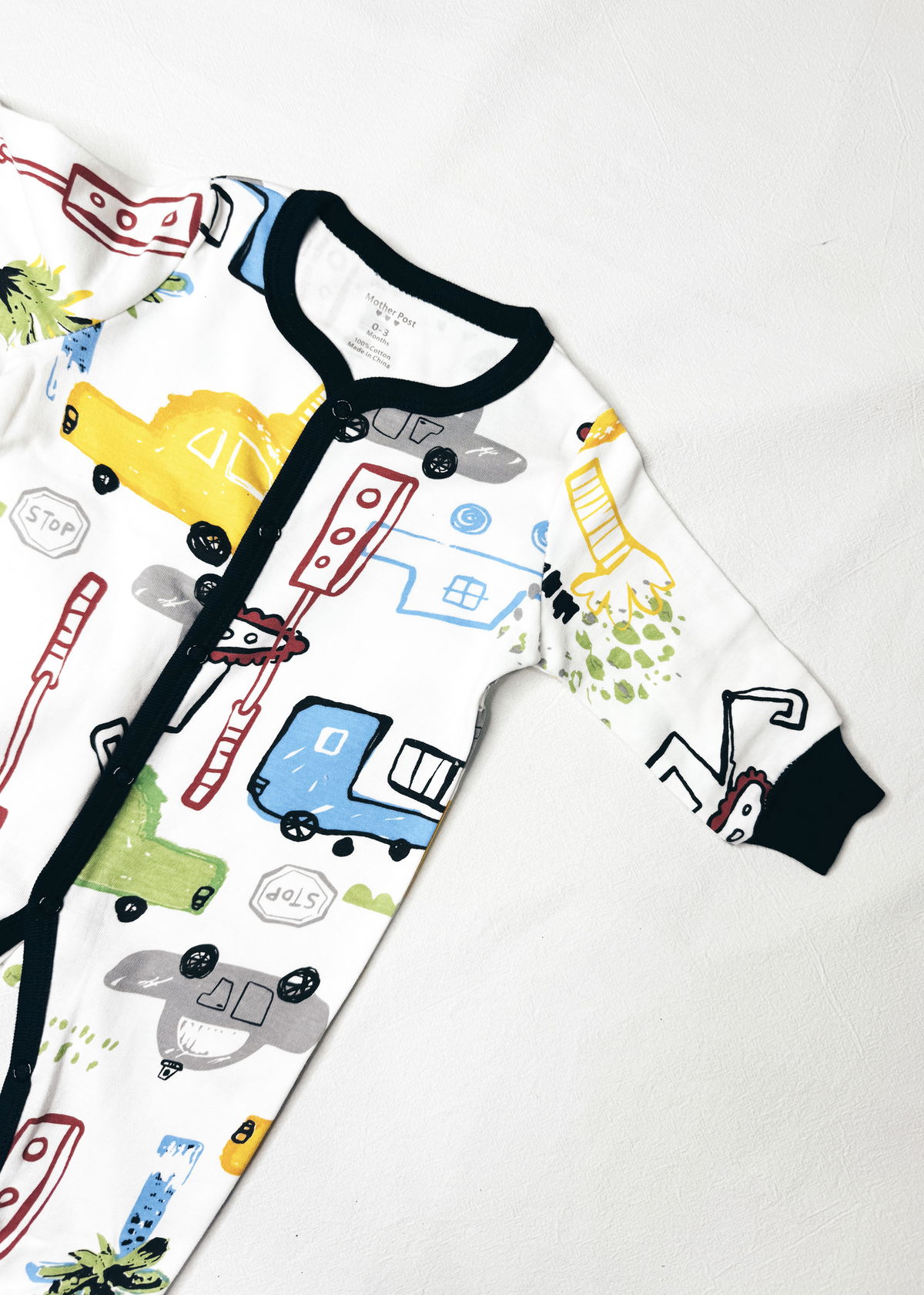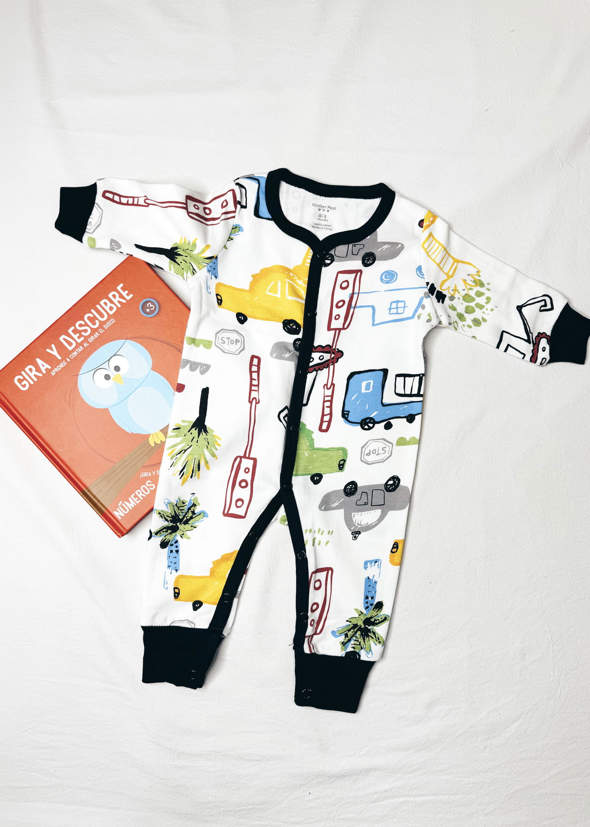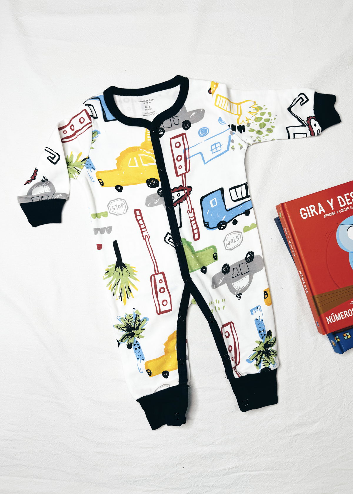 Enterito en tono blanco con detalles en negro y estampado de semáforos y vehículos. Este modelo viene con broches a presión en el frente y entre piernas.