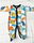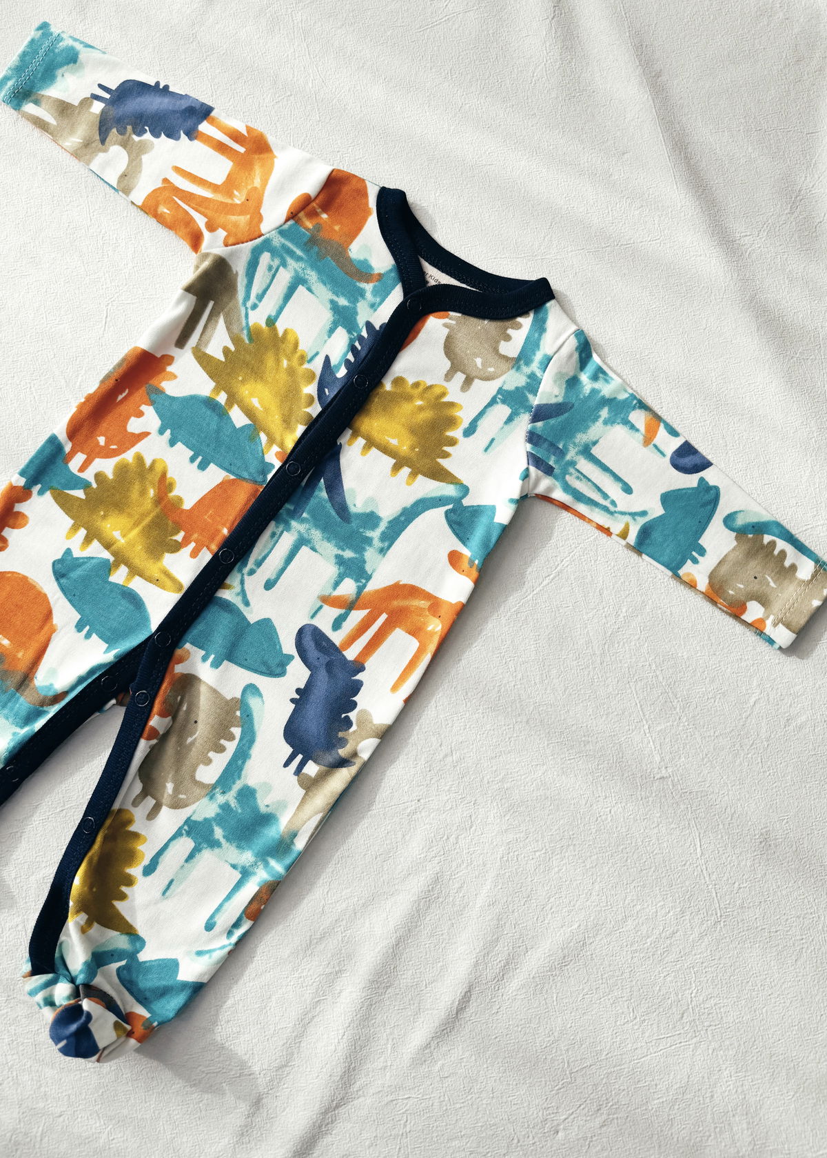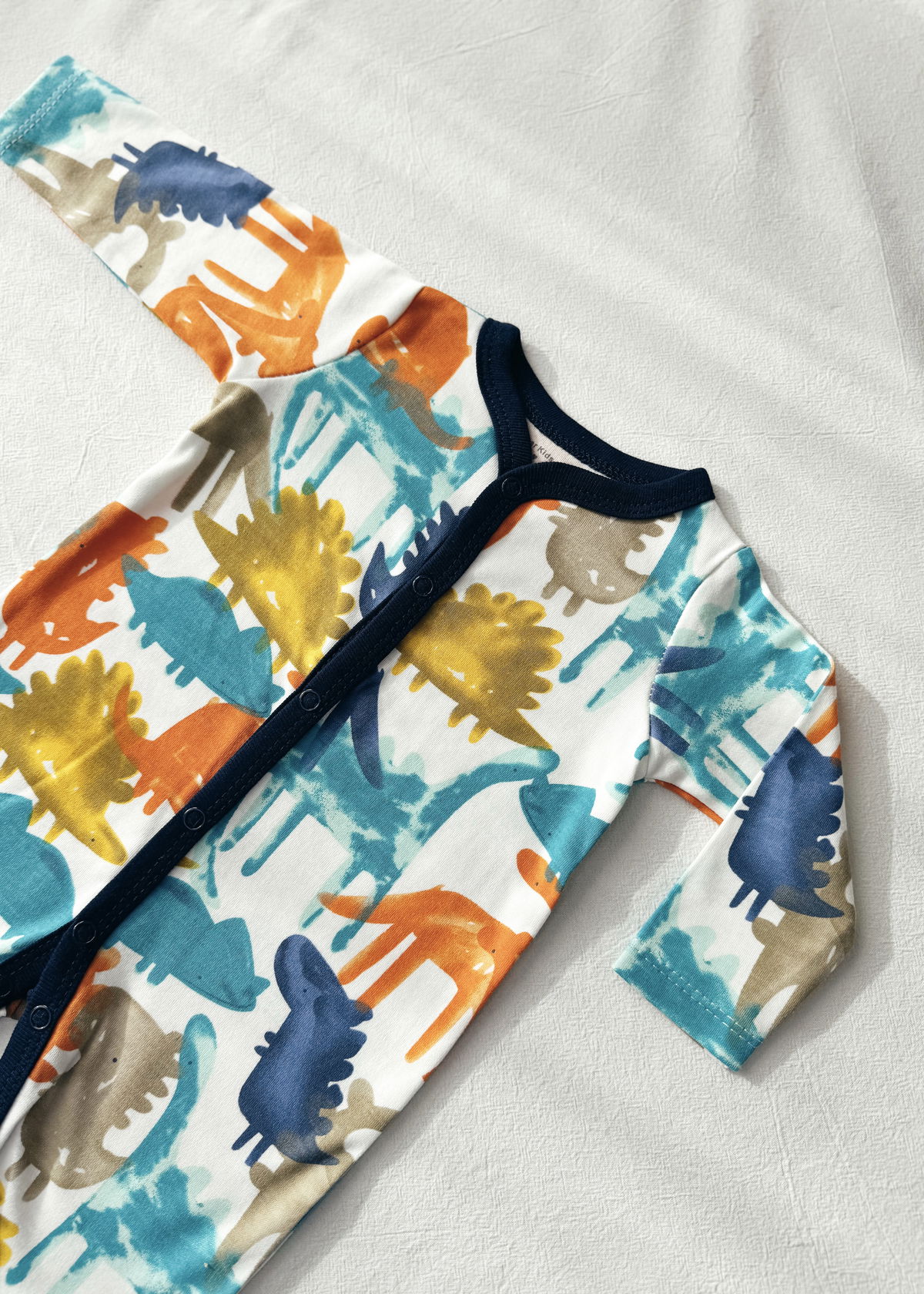 Enterito con estampado de dinosaurios y detalles en azul oscuro, este modelo viene con broche a presion en el frente y entre piernas.