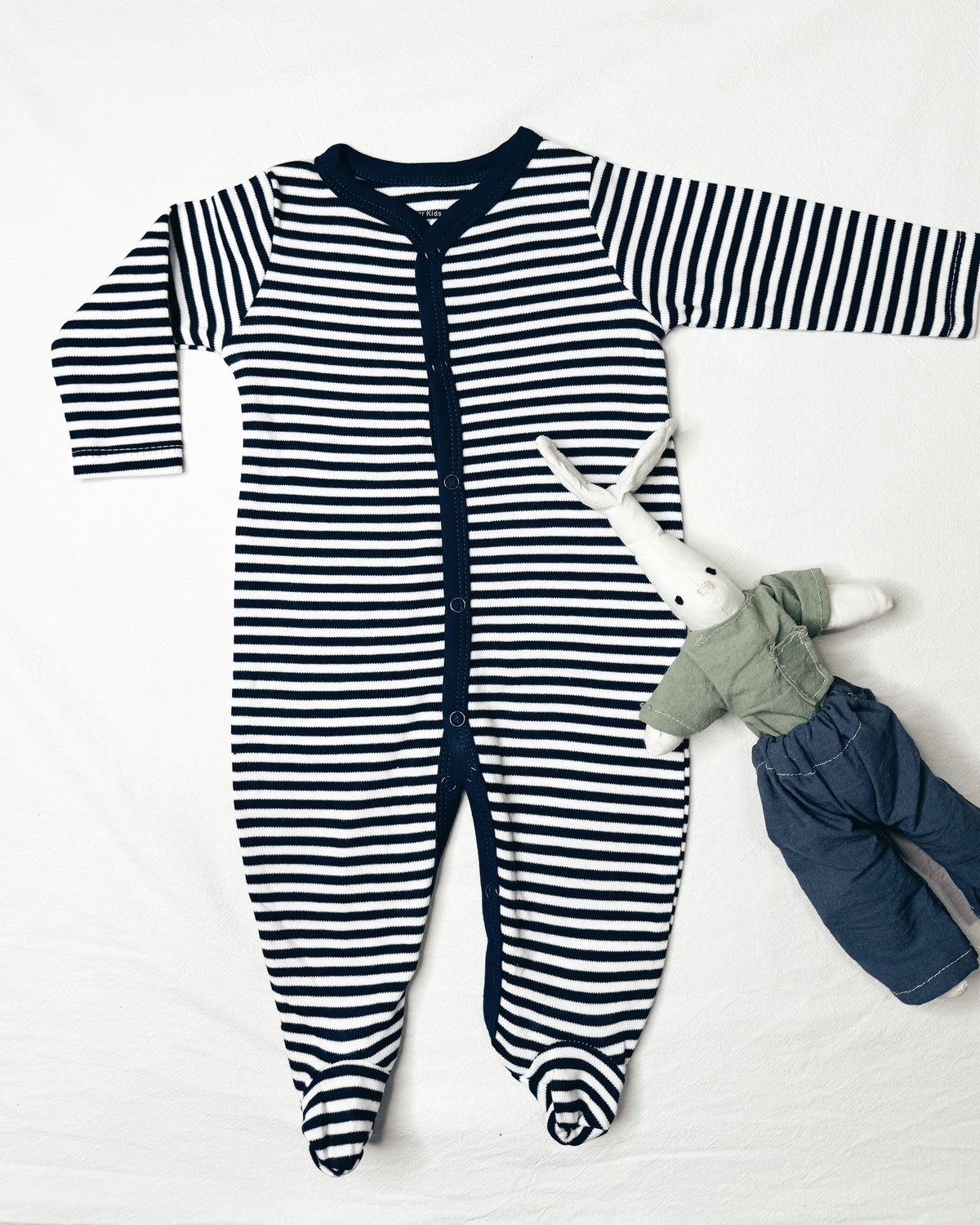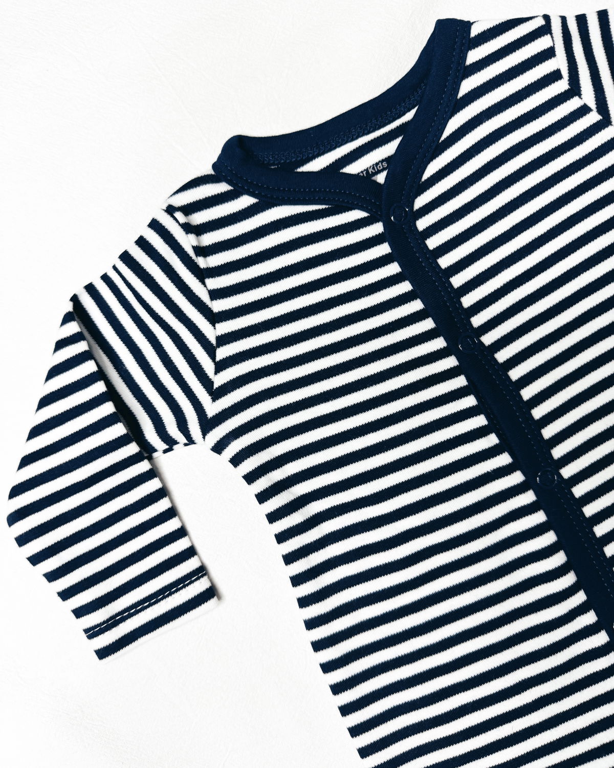 Enterito a rayas blancas sy azul con broches a presión en el frente y entre piernas con piecitos cerrados.