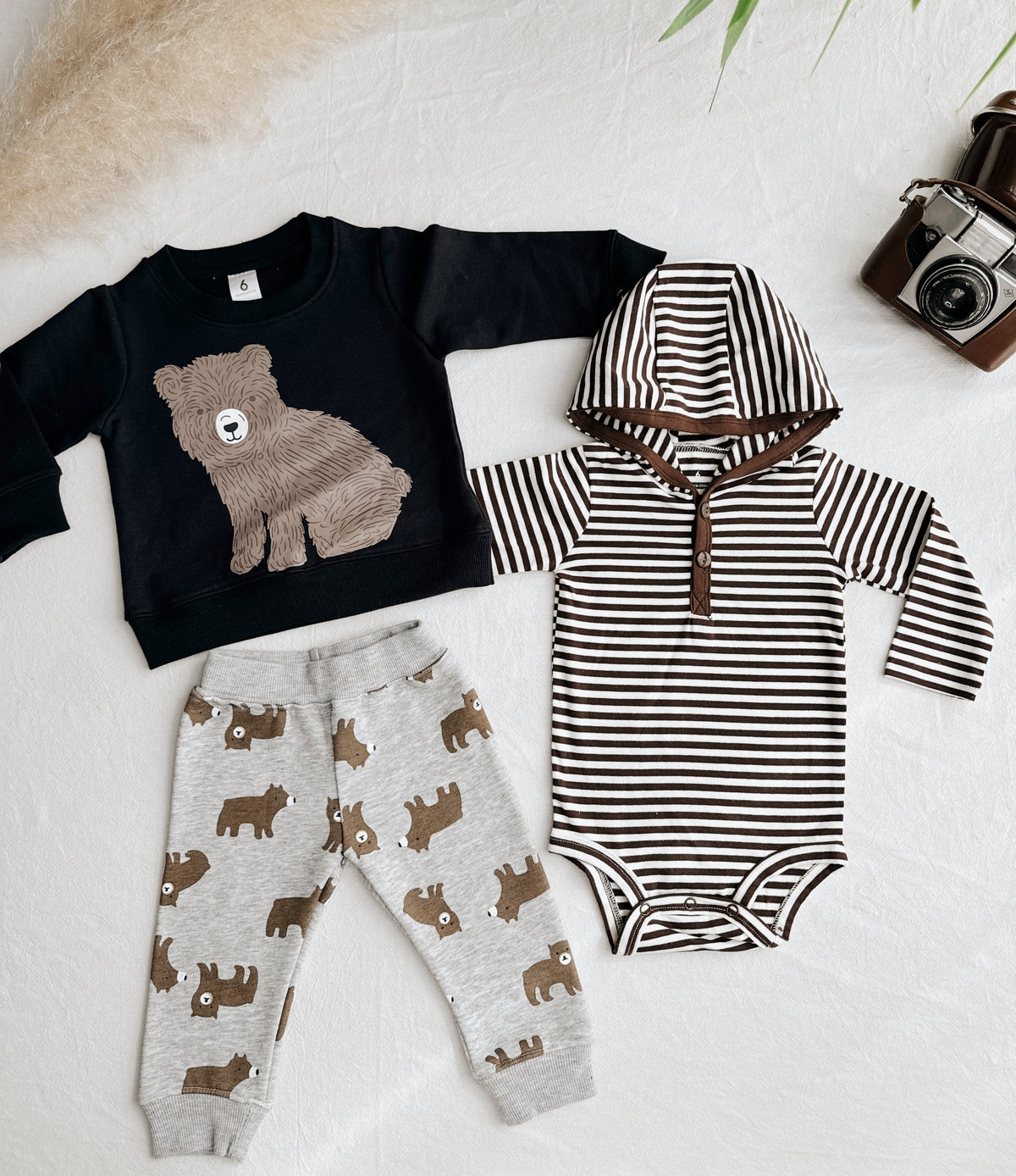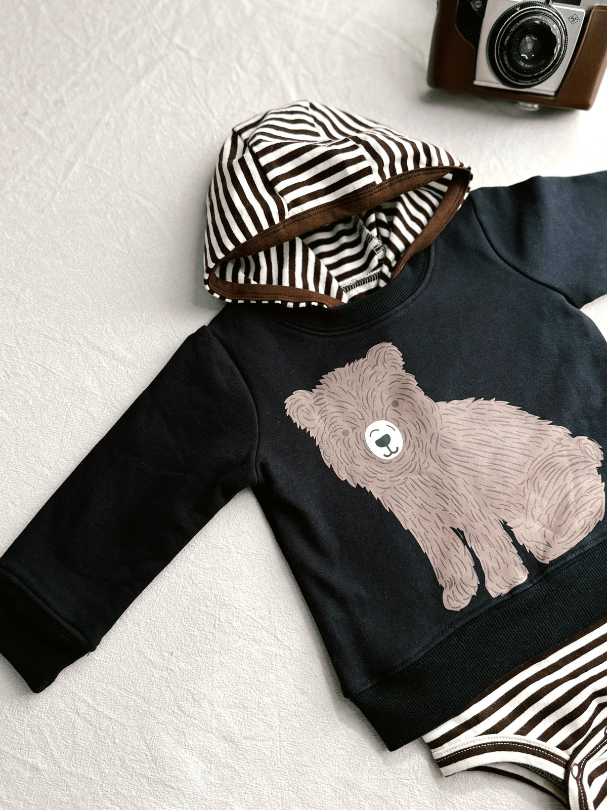 Este Conjunto de 3 piezas viene con un body con capucha a rayas marrón y blanco y unos botoncitos en su frente. Buzo azul con un estampado súper tierno de de baby Bear y Pantalón gris gaspeado con diseño de baby Bear, tanto el buzo como el pantalón son frisados, ideales para estos días que se arranca la mañana bien fresquito.