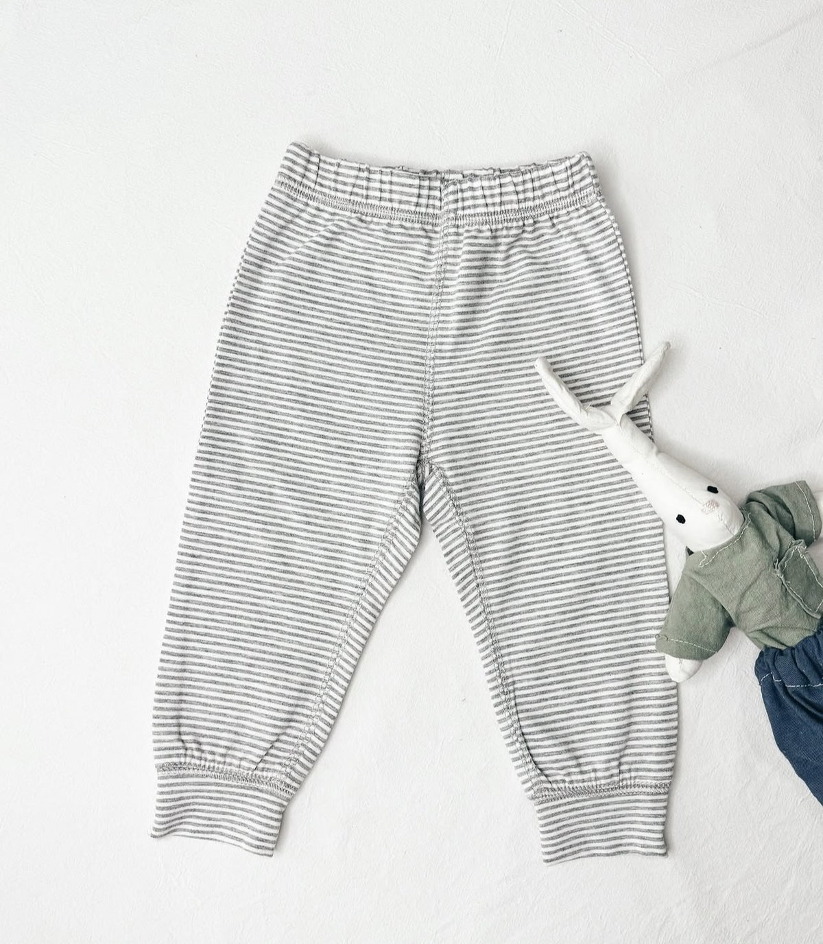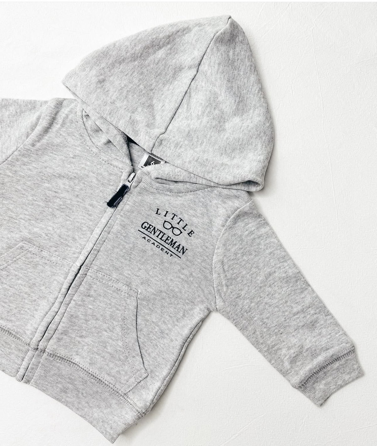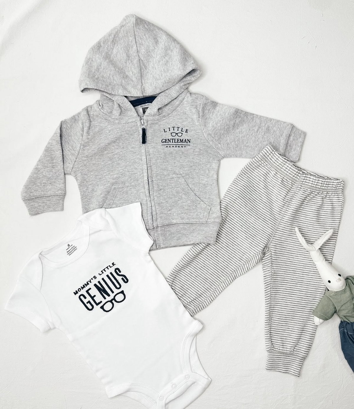 Conjunto de 3 piezas, body m/c en blanco con estampado en azul, campera con capucha en gris gaspeado y pantalón rayado en gris y blanco.