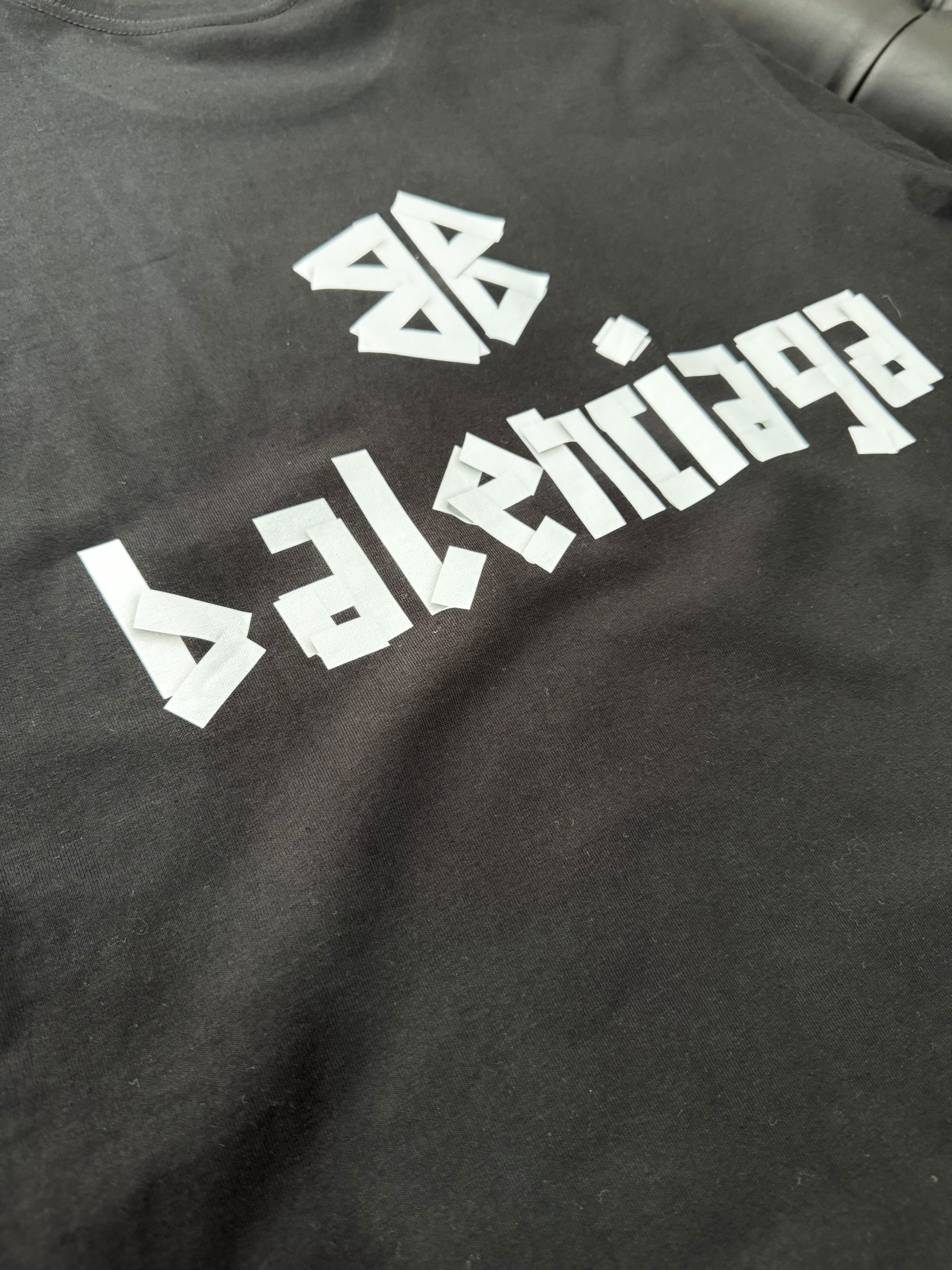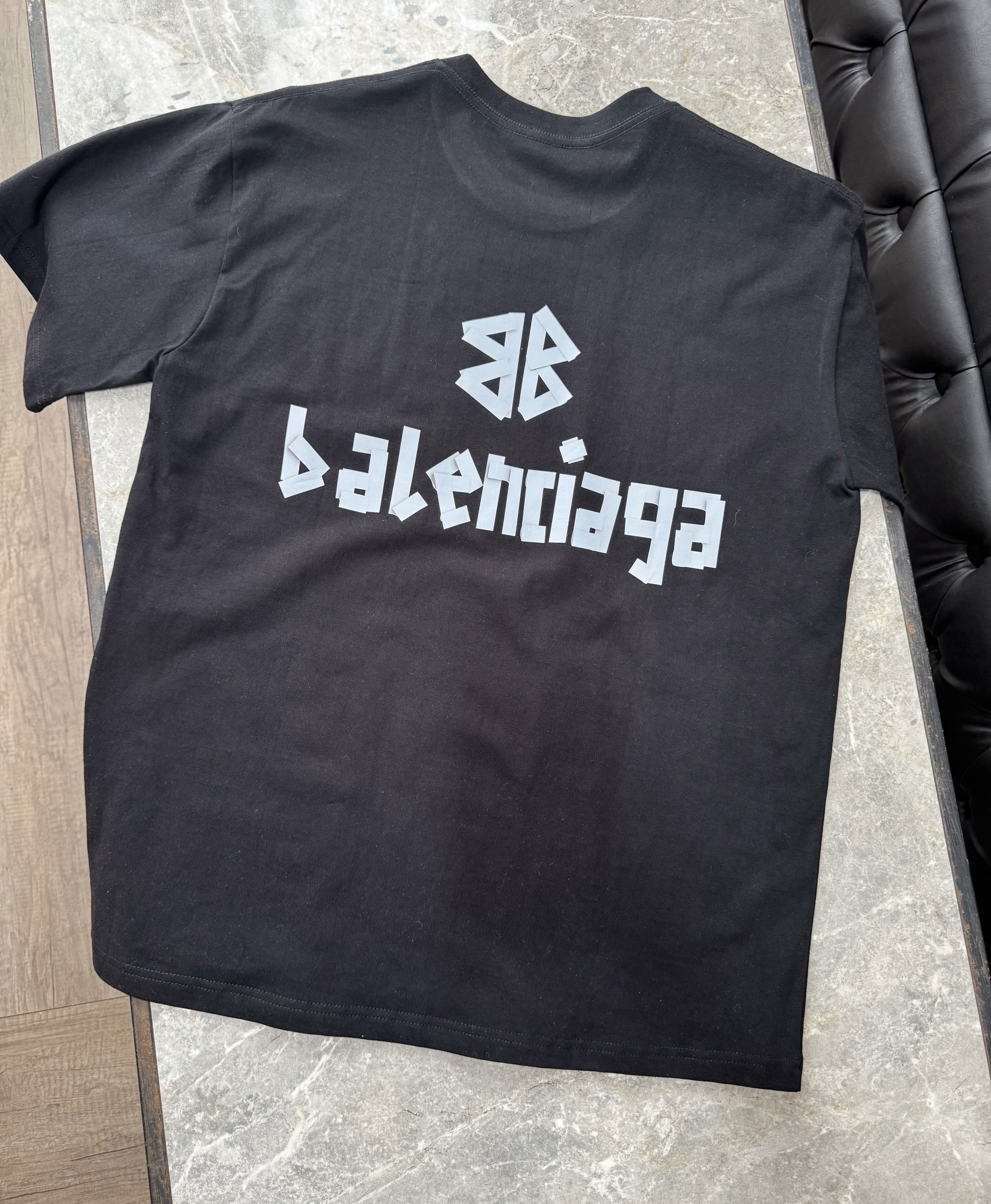 El frente presenta el logo Balenciaga en tipografía bold estilo ribbon, mientras que en la parte trasera se repite con diseño ampliado junto al icónico símbolo BB, creando un look urbano con presencia sin ser excesivo.