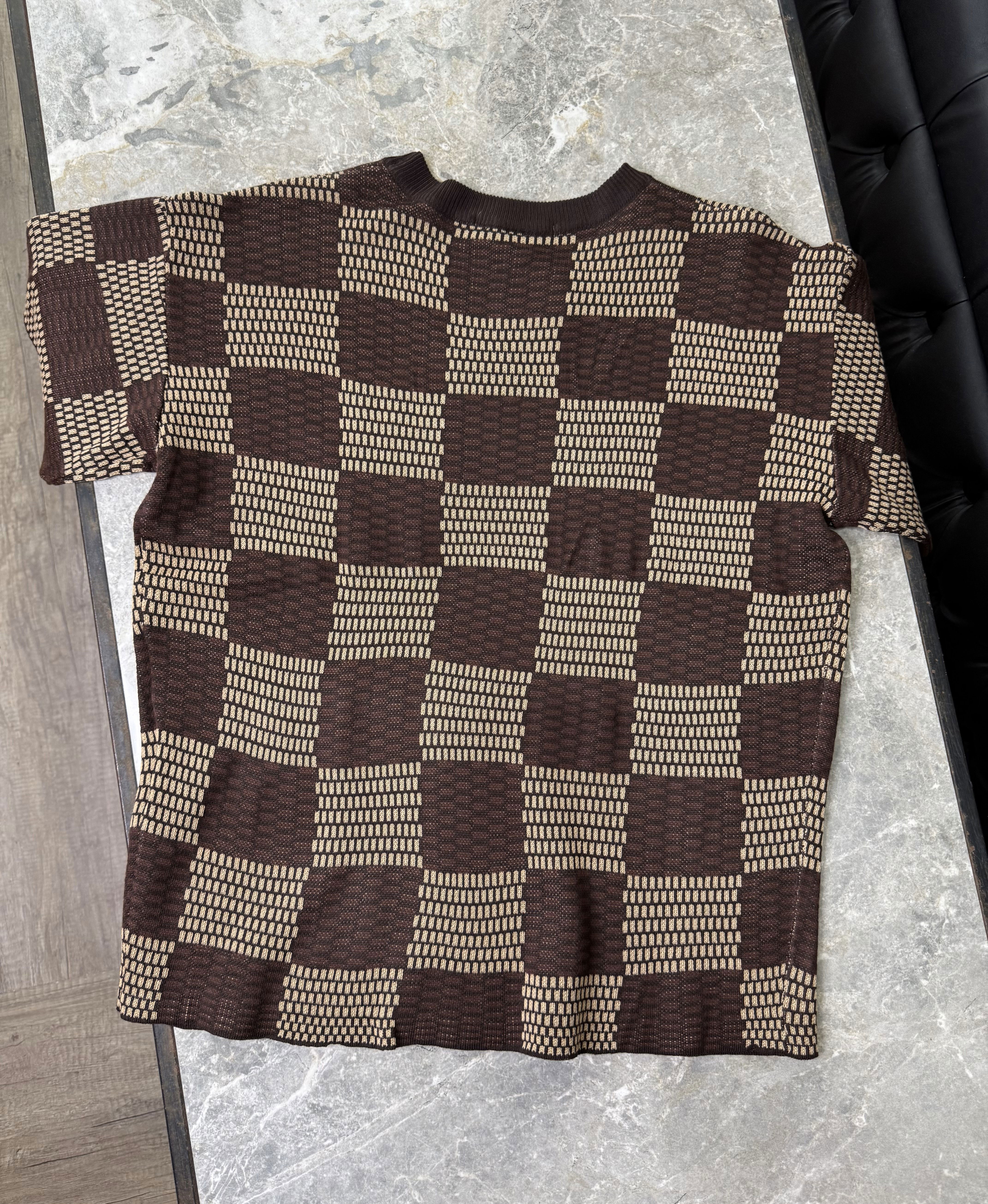 Esta remera lleva el clásico patrón damier reinterpretado en una versión tejida que aporta relieve, textura y un acabado más sofisticado. Su paleta en tonos marrón y beige le da un estilo elegante, moderno y fácil de combinar con denim oscuro, joggers o looks nocturnos.