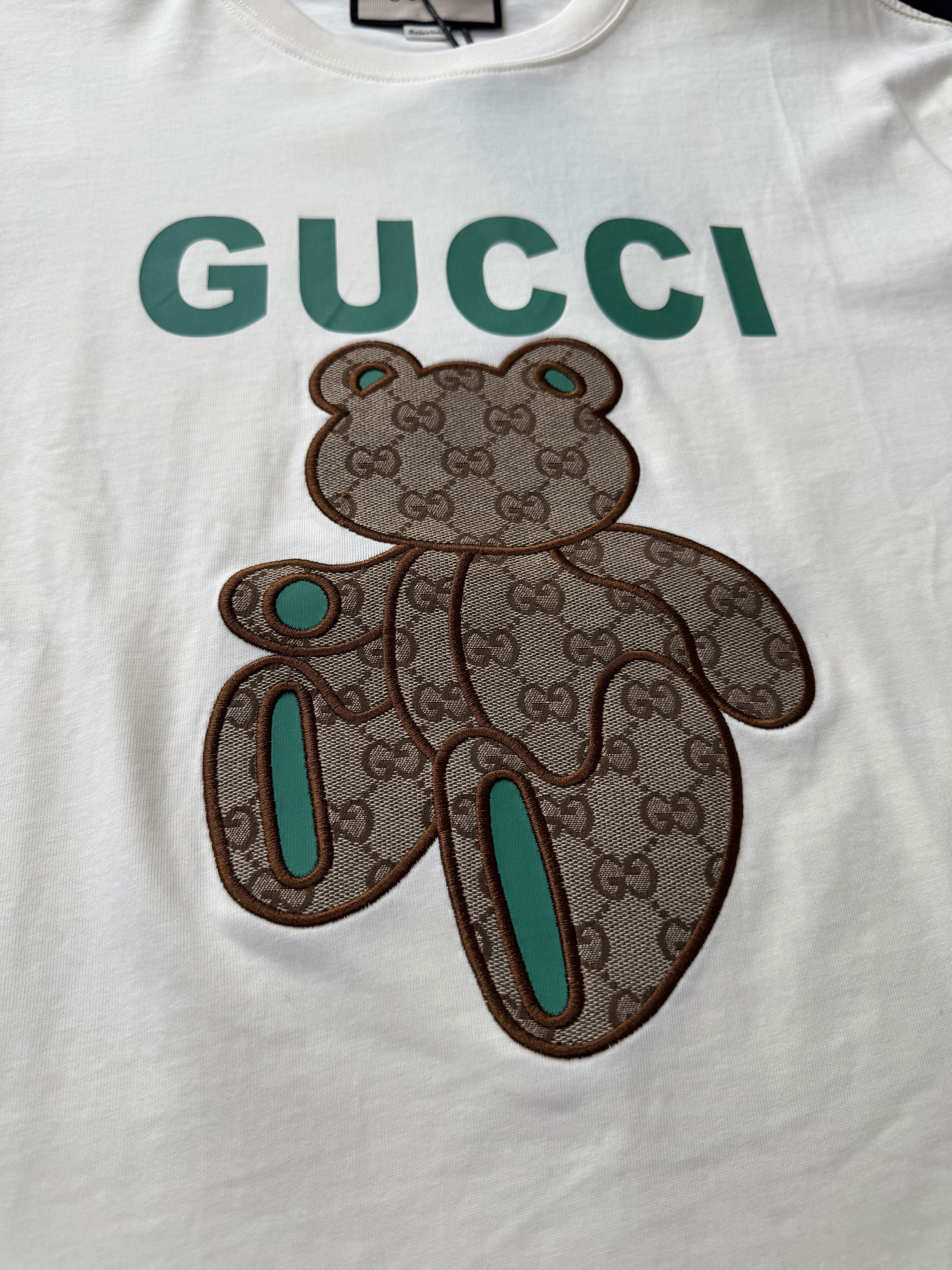 Esta remera combina el ADN clásico de GG con un toque divertido y actual. En el frente incorpora el logo en tipografía bold acompañado por un oso bordado con monograma y detalles contrastantes, logrando una pieza moderna, llamativa y con identidad fashion.