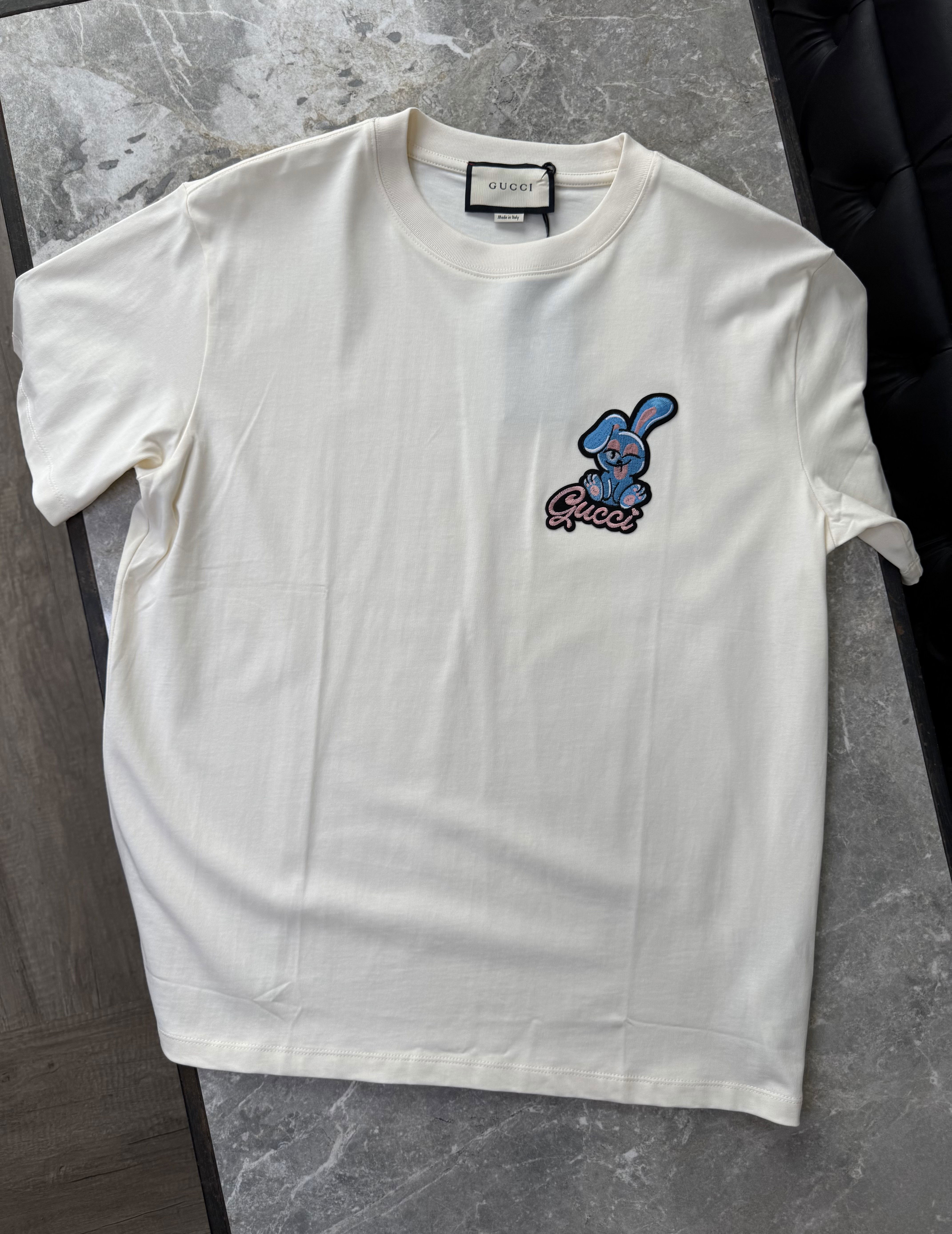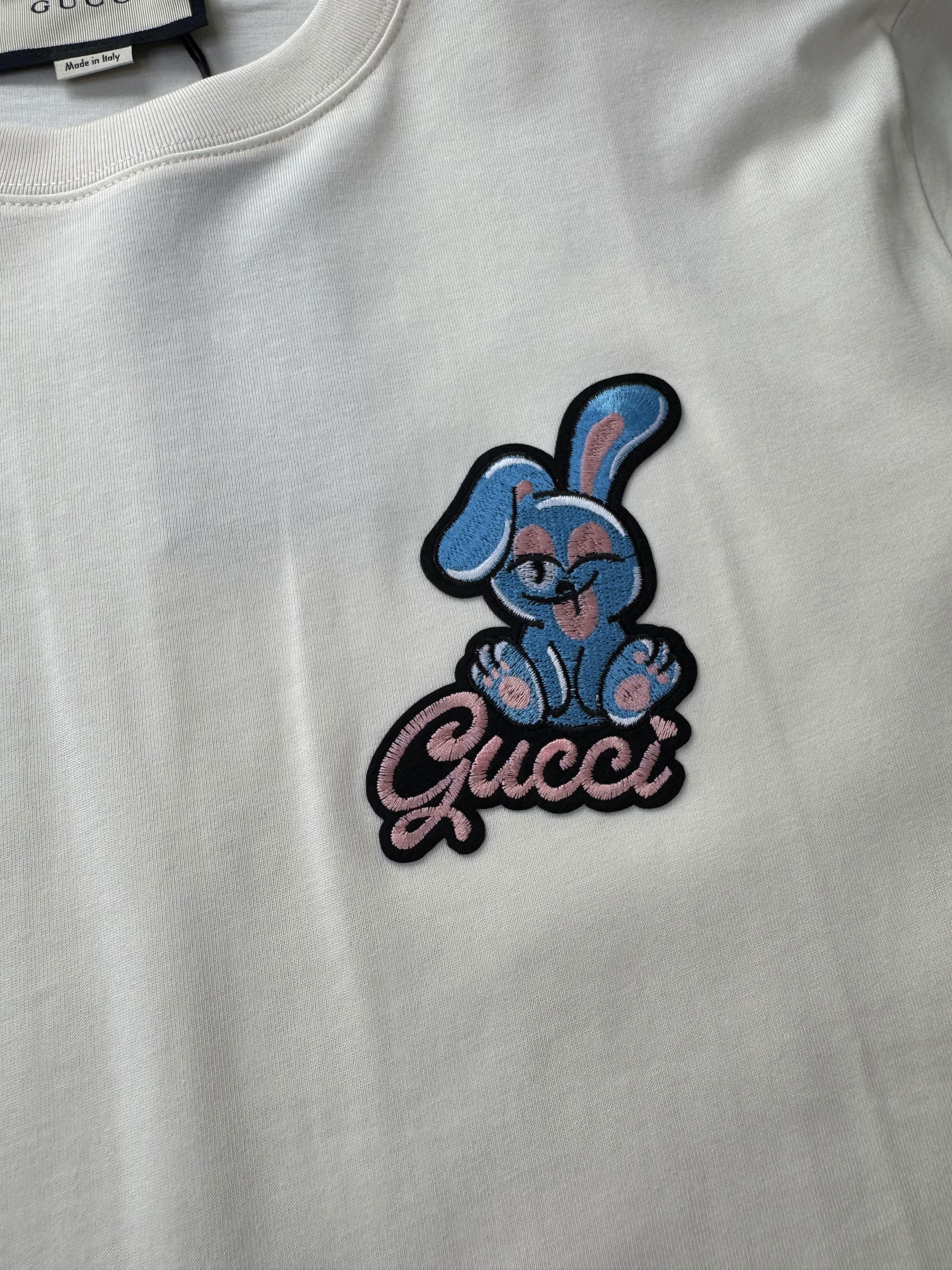 Esta remera fusiona el estilo clásico de GG con un toque playful y moderno. En el frente presenta un parche bordado con un conejo estilo cartoon y el logo en tipografía script, donde los tonos pastel suman personalidad y un aire juvenil sin perder el ADN luxury de la marca.