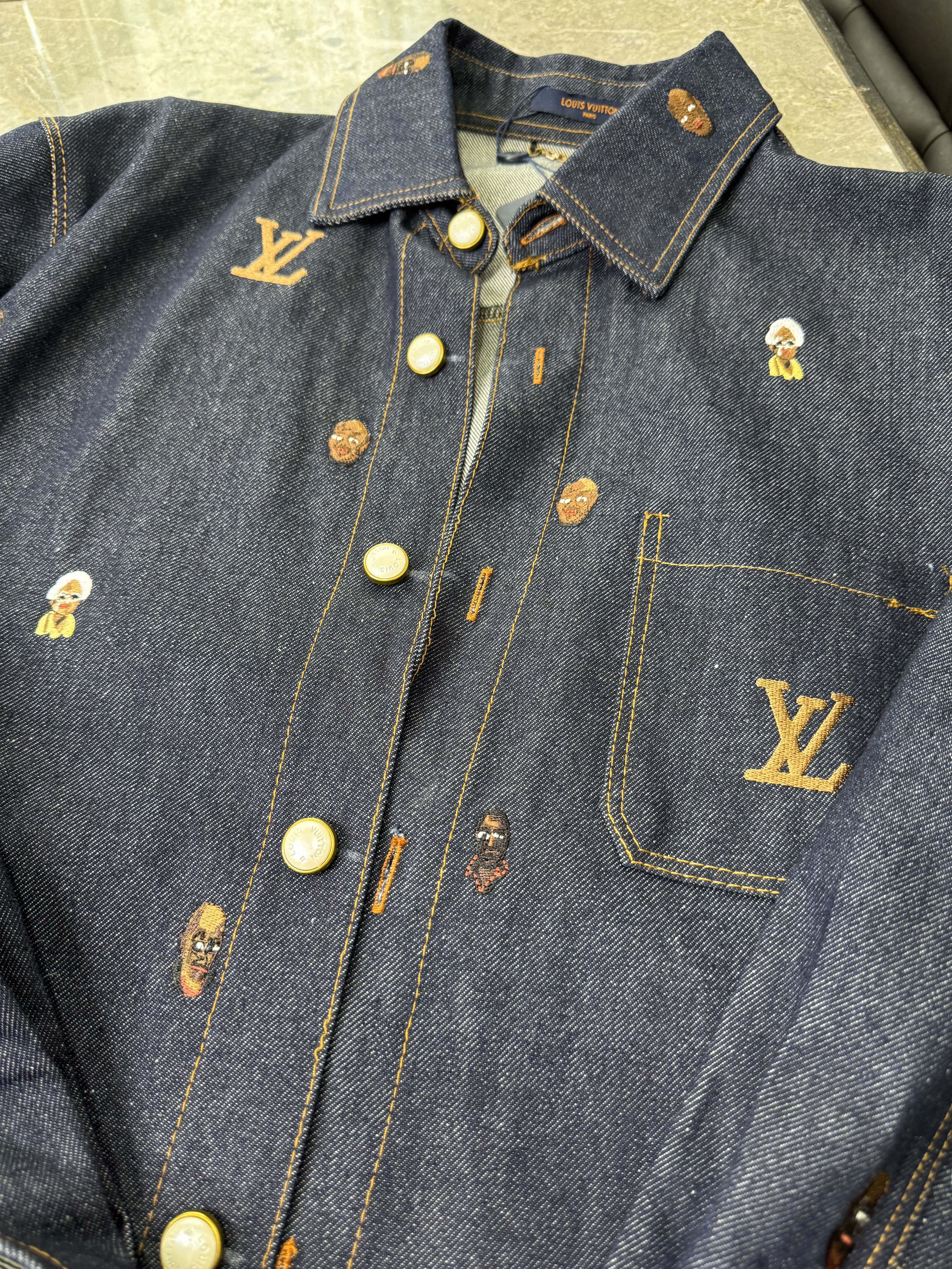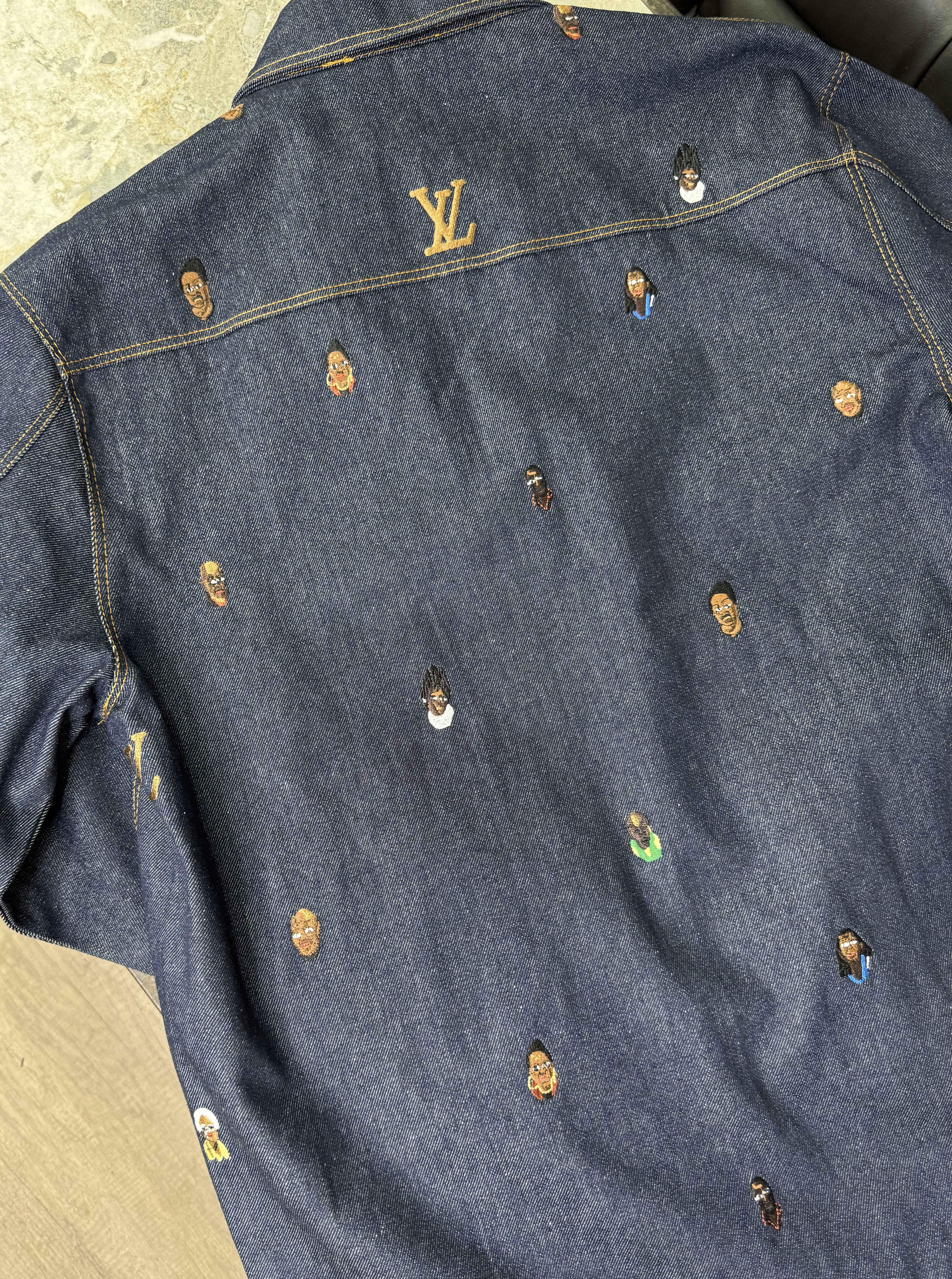 Ambas piezas —camisay pantalón— incluyen bordados distribuidos estratégicamente, representando rostros estilizados en distintos tonos y expresiones, aportando una estética única con personalidad. El famoso monograma LV bordado en hilo contrastante aparece en la parte delantera y trasera, reforzando el ADN luxury de la marca.