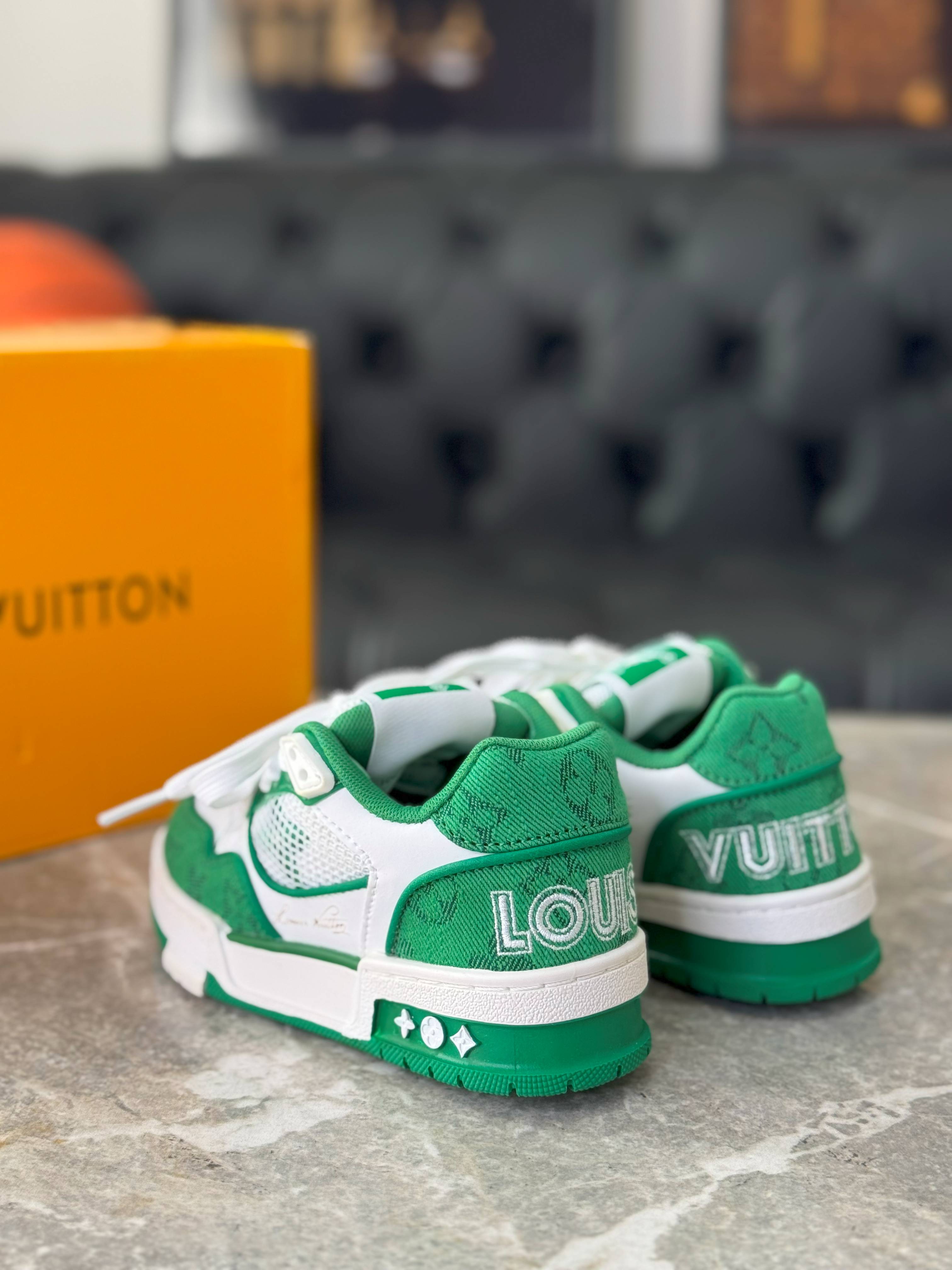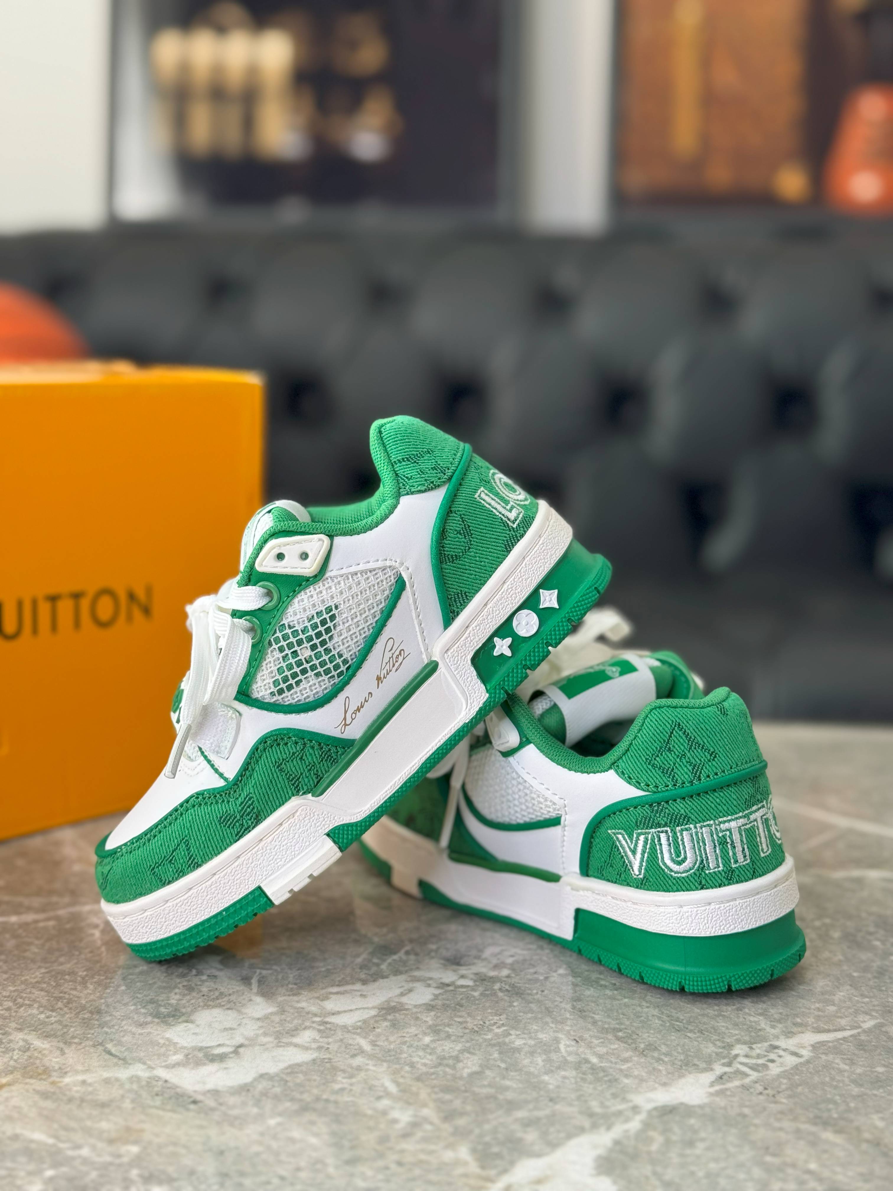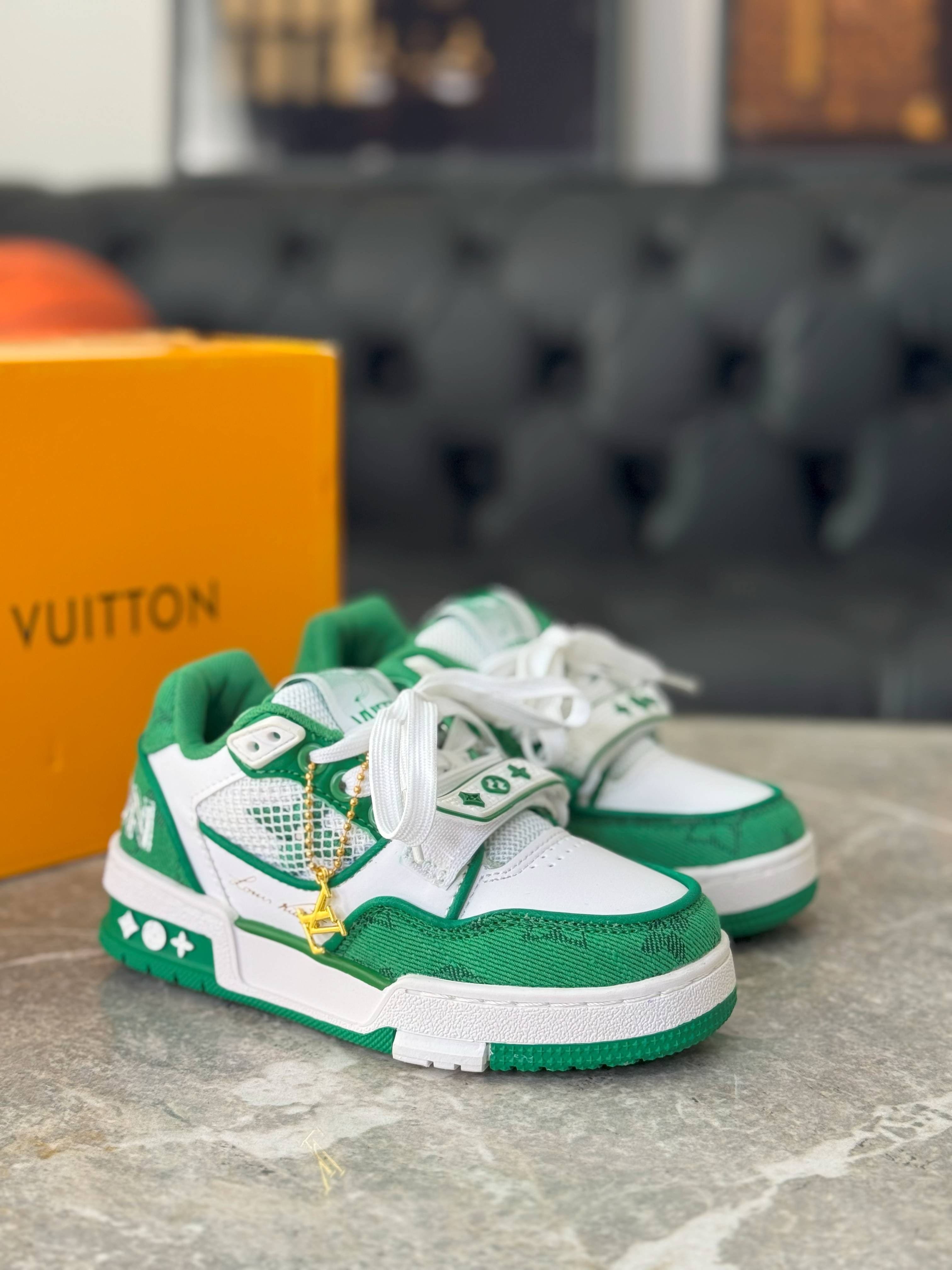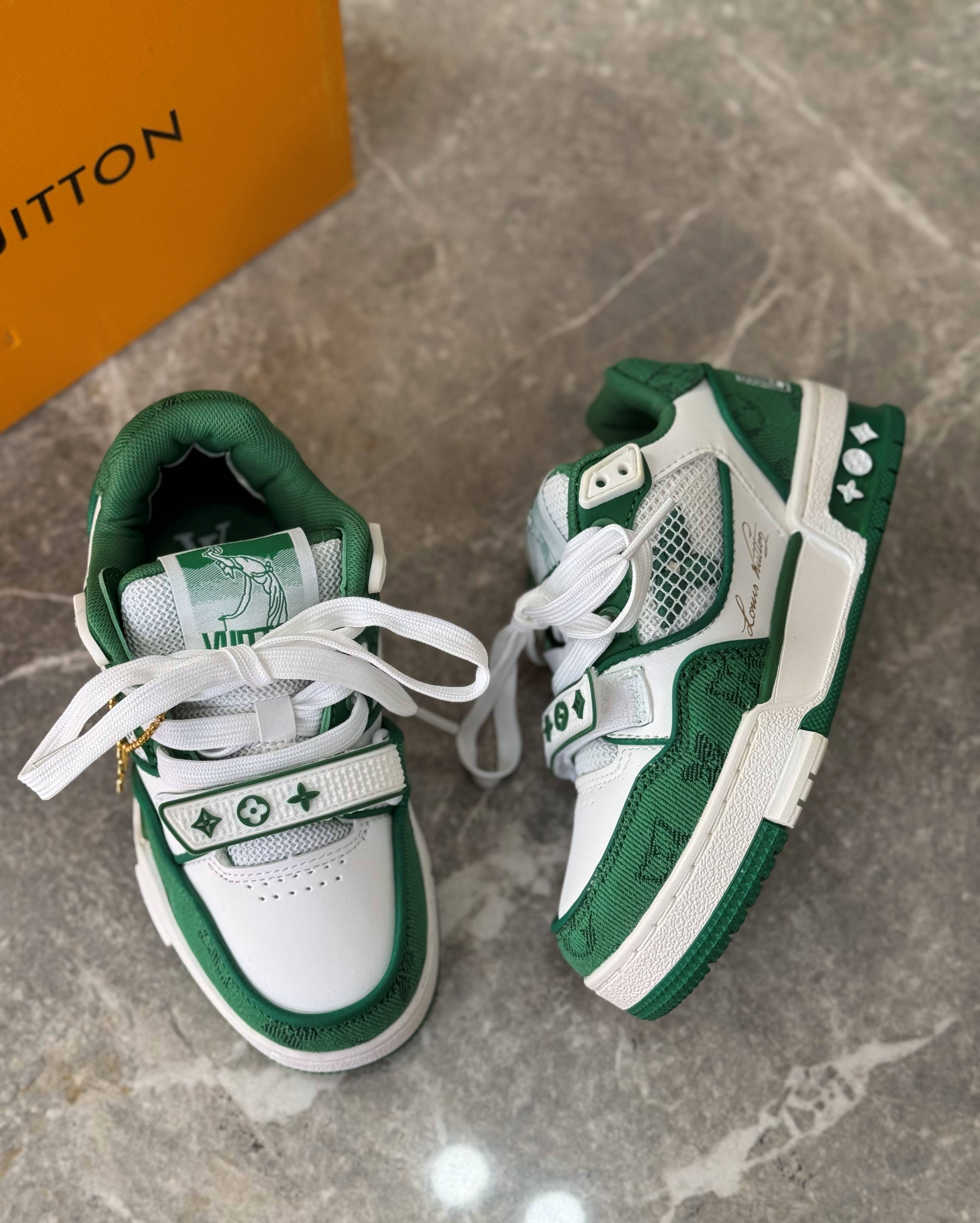 Zapatillas en combinación verde + blanco, diseñadas con paneles texturados, mesh respirable y detalles monograma sutiles pero protagonistas. Un modelo con vibra urbana, cómodo y con ese toque exclusivo que transforma cualquier outfit.