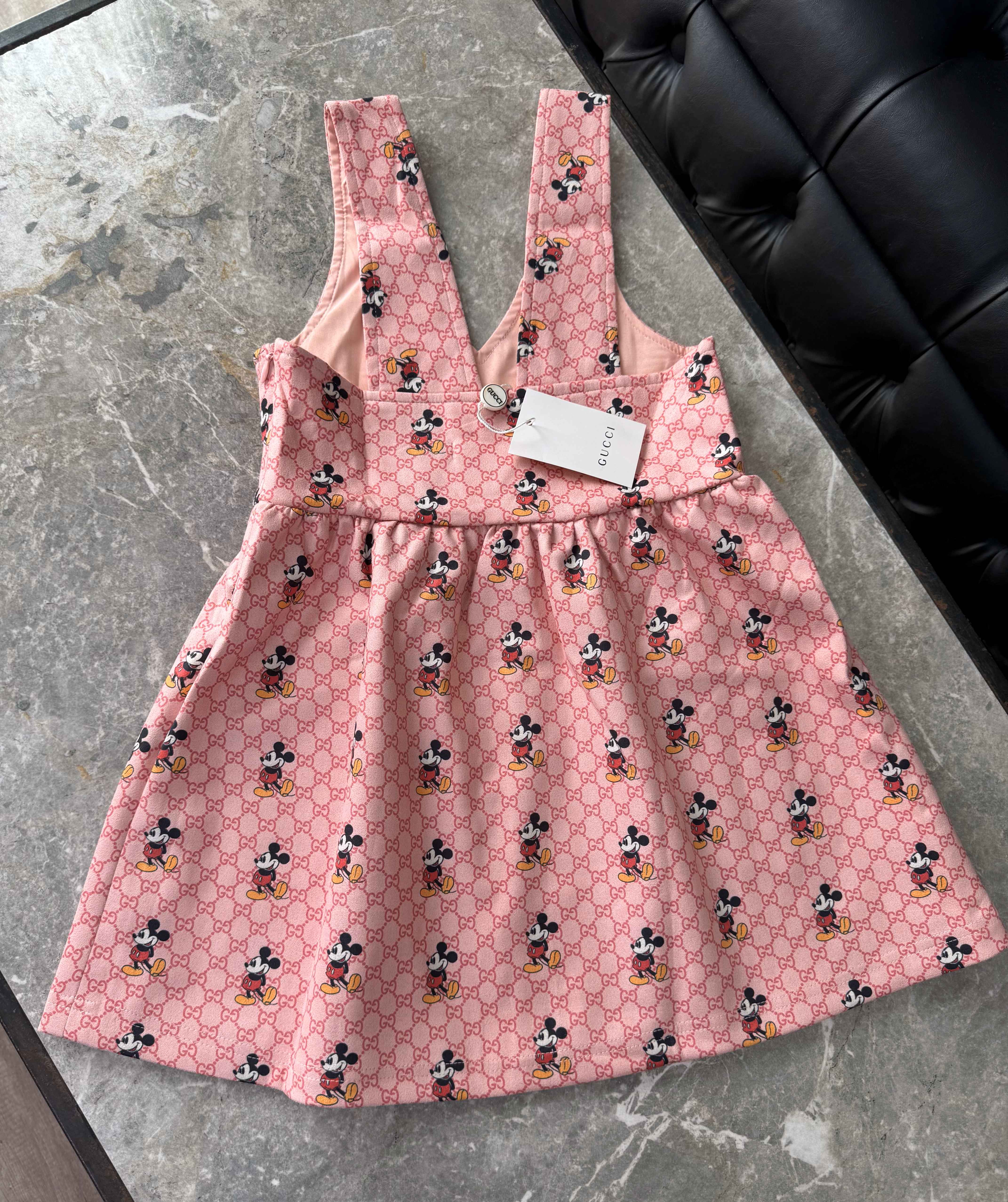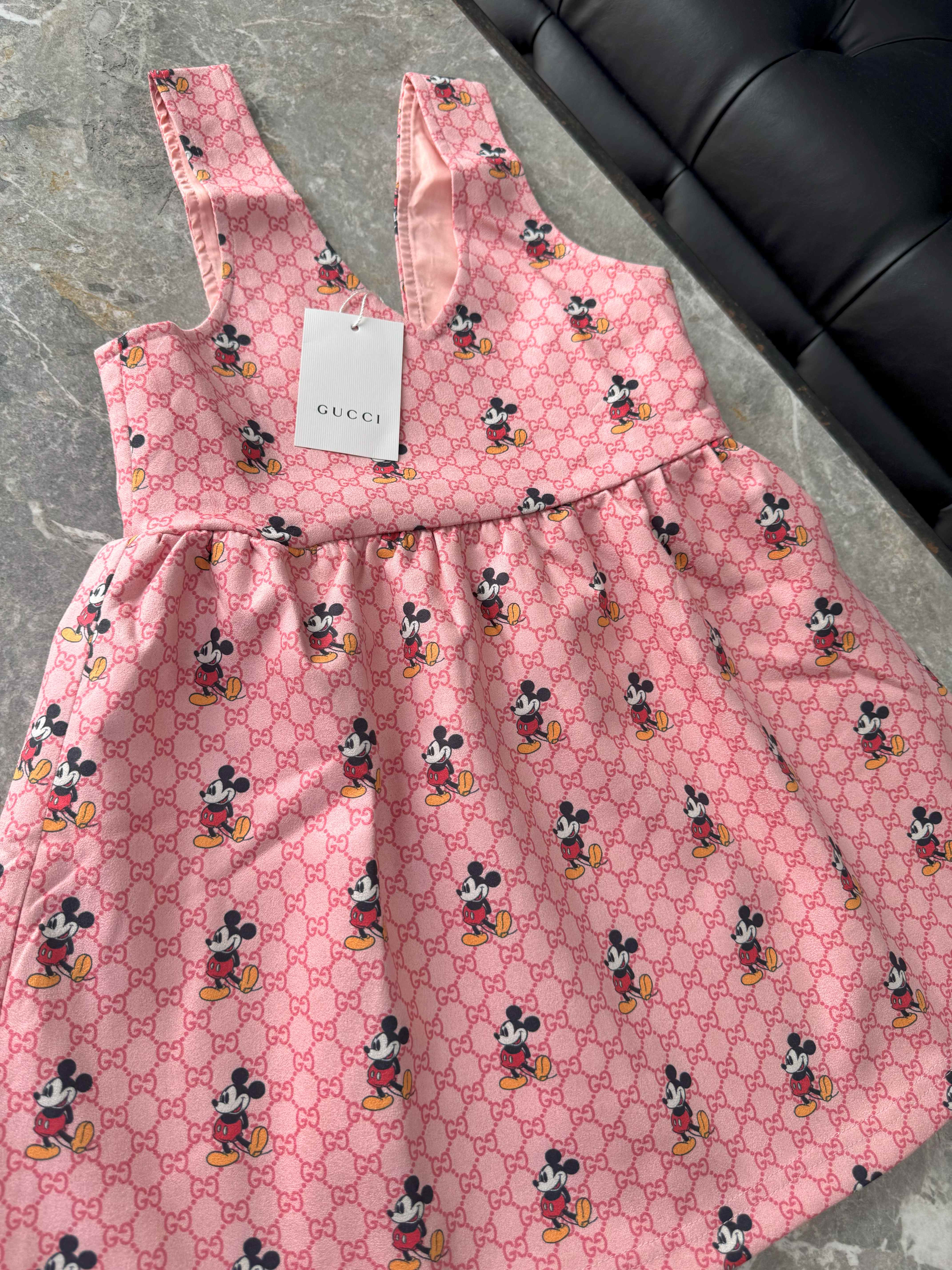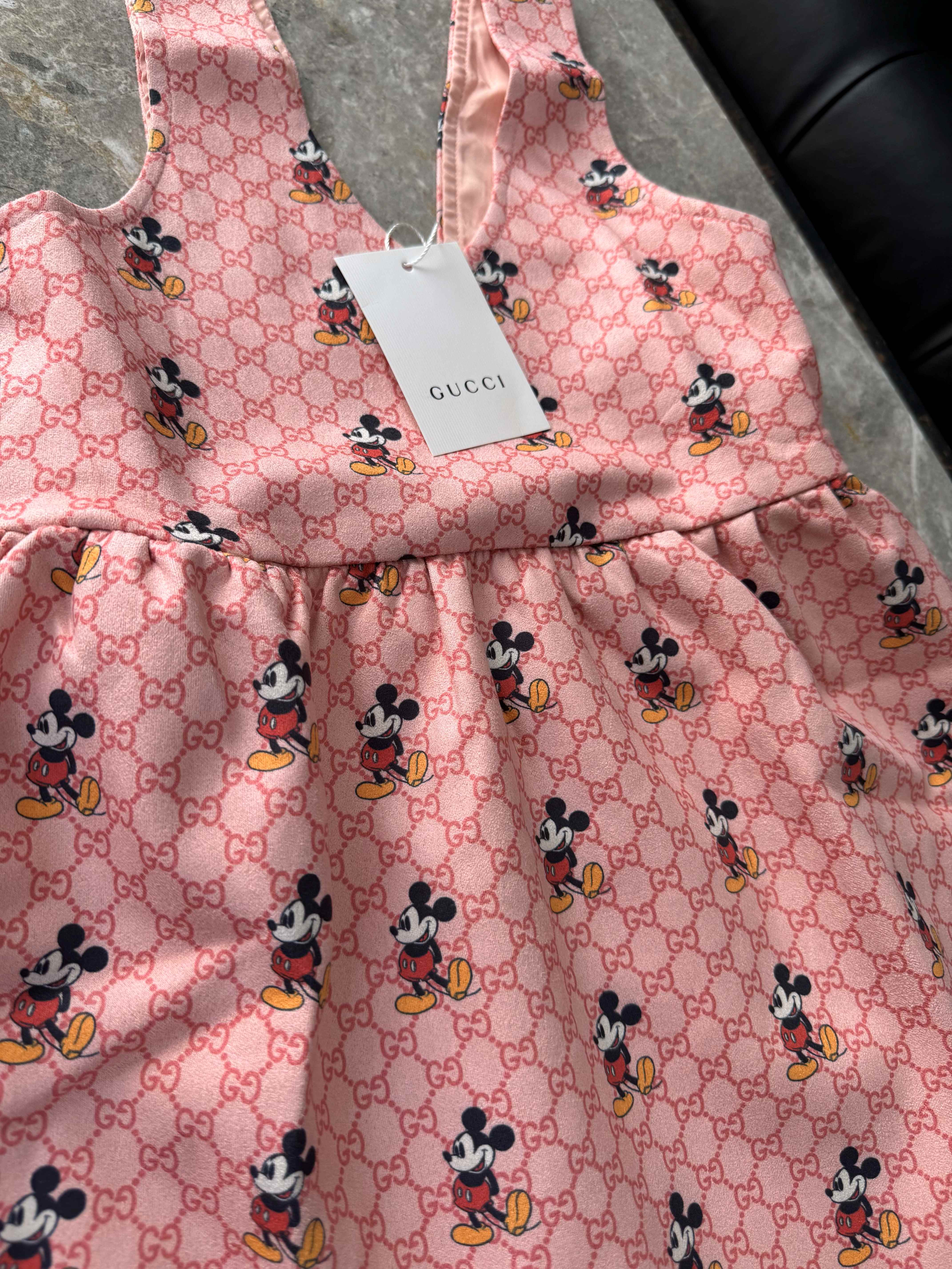 Este vestido estilo jumper con estampado completo de Mickey Mouse está pensado para las peques que aman verse con estilo sin perder comodidad. Su diseño en tono rosa con monograma GG aporta un toque de lujo infantil, mientras que el print divertido hace que sea perfecto para looks relajados, cumpleaños o fotos especiales.