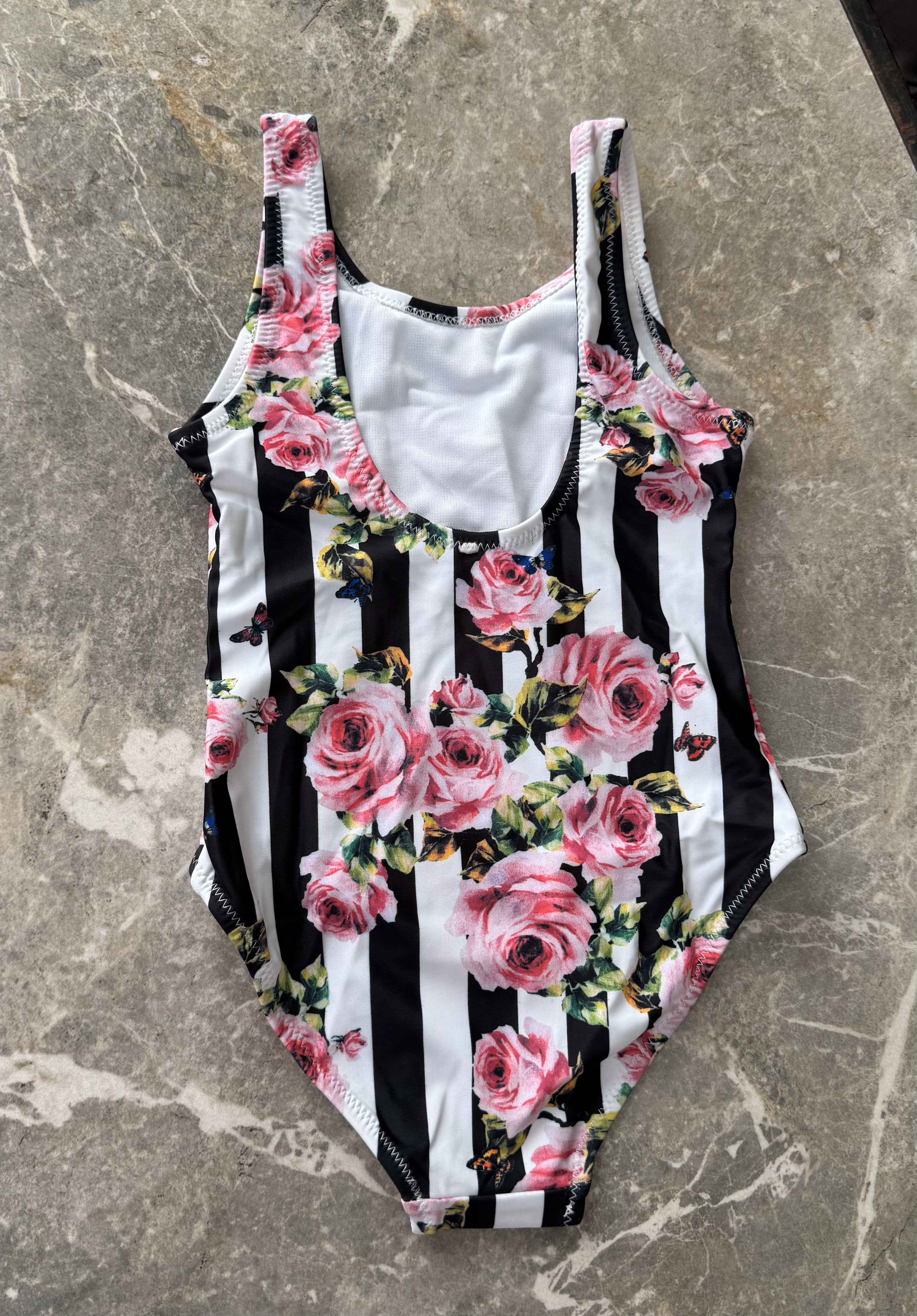 Esta malla enteriza está diseñada para quienes aman los detalles y buscan un look con personalidad incluso en días de pileta o playa. El estampado de rosas en tonos rosados sobre fondo a rayas blanco y negro crea un contraste único y súper elegante, ideal para destacar con un estilo fresco y moderno.