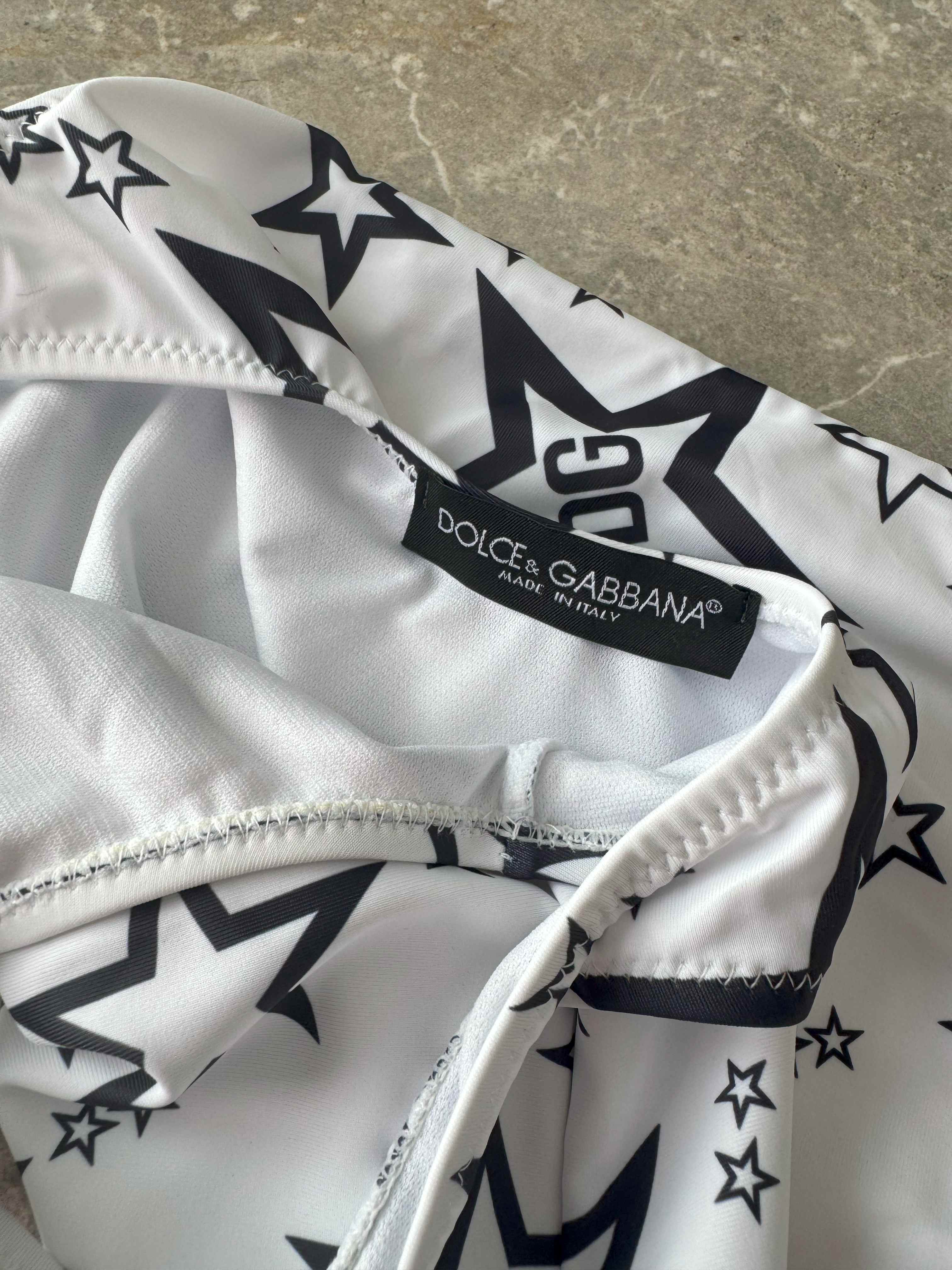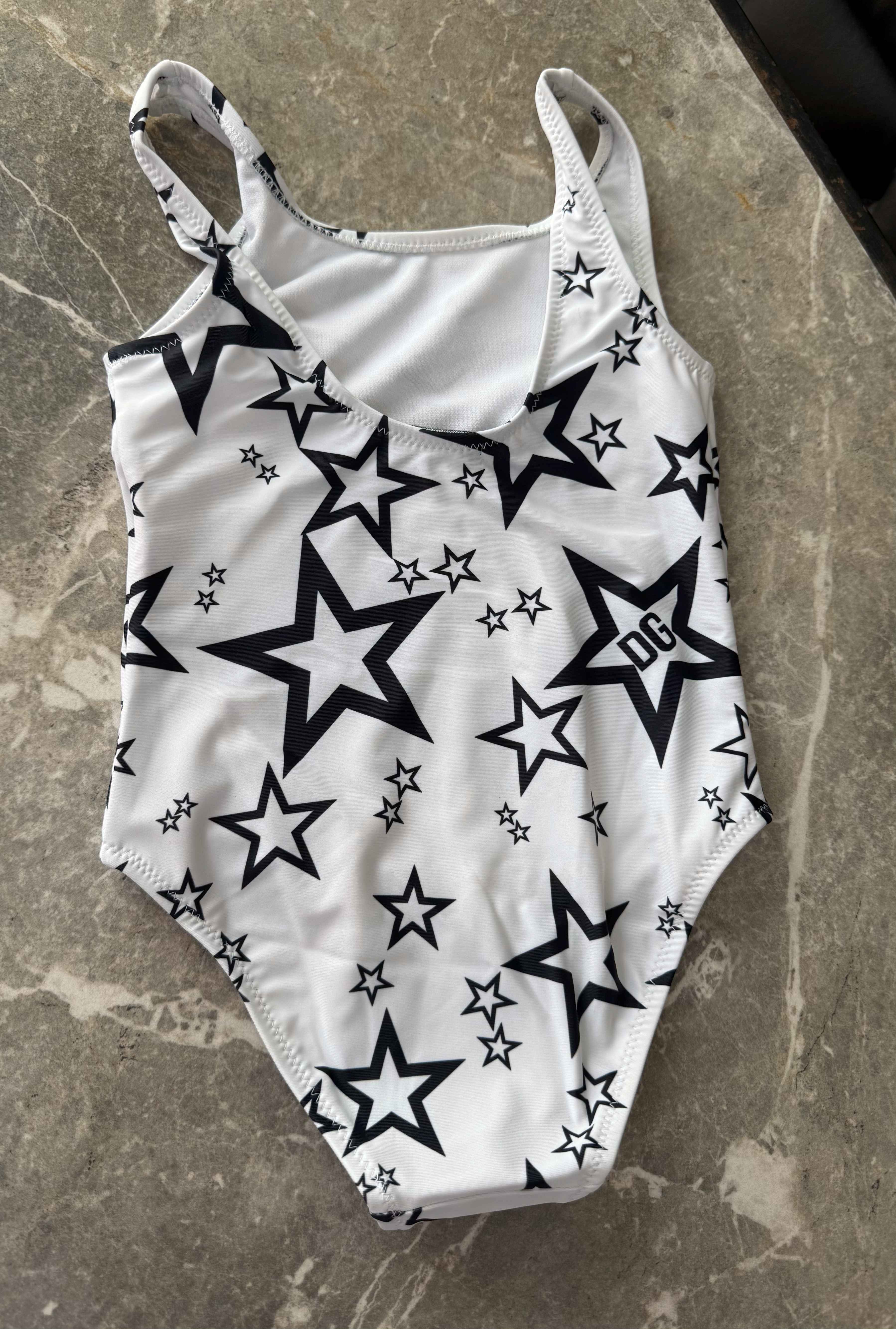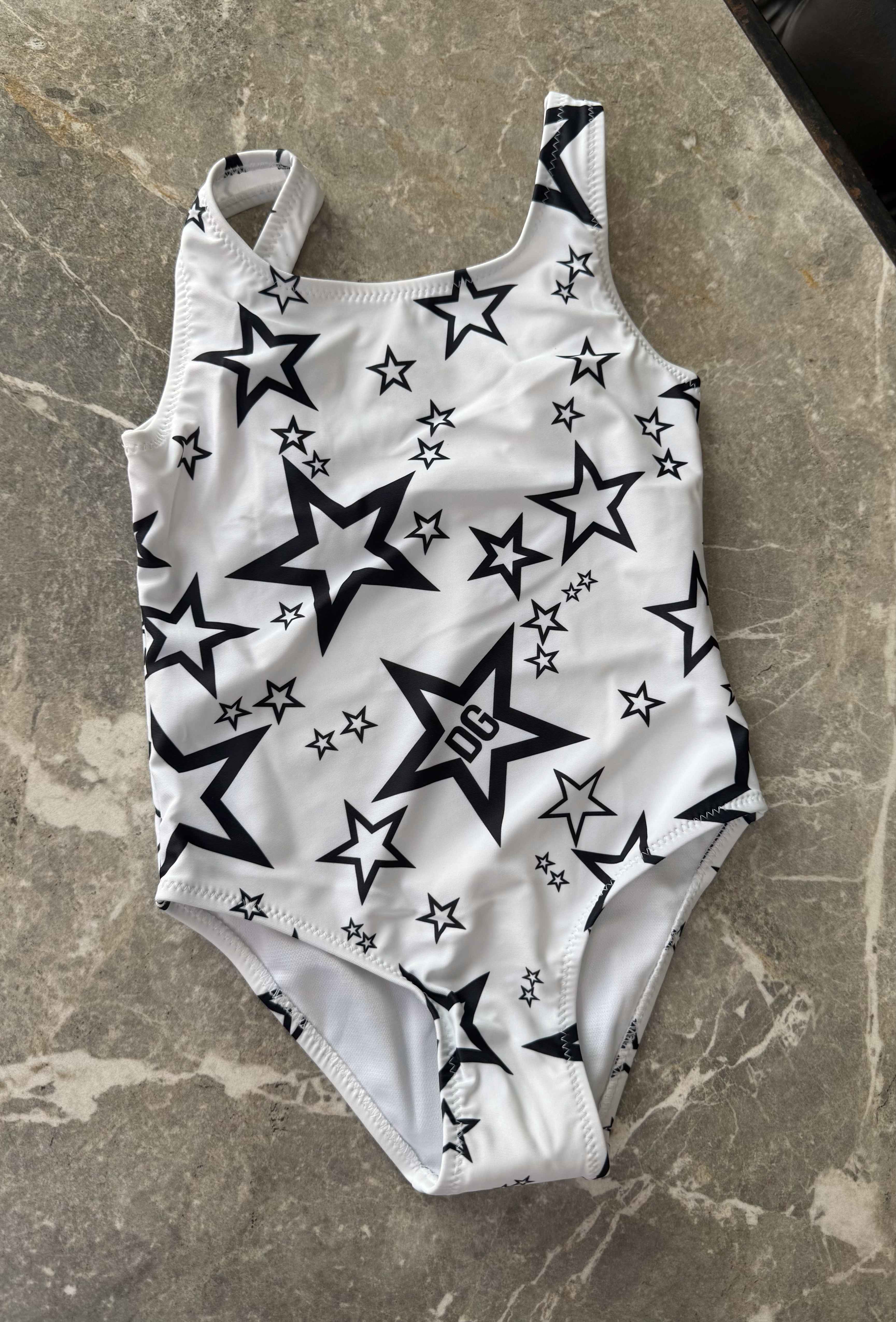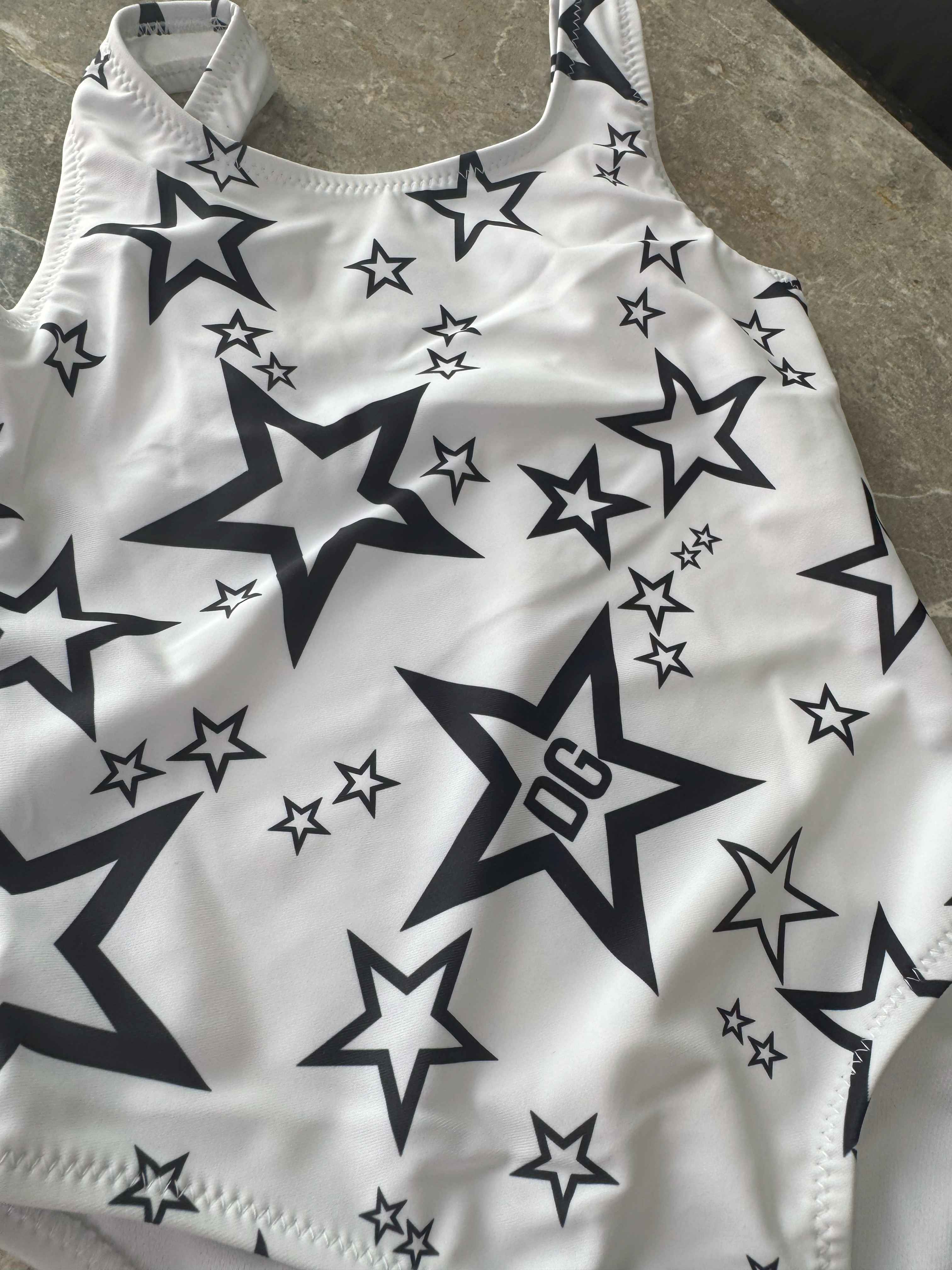 Ideal para las pequeñas que aman destacar con estilo, esta malla enteriza combina un diseño moderno con comodidad total. Su fondo blanco con estampa de estrellas negras y detalle DG central le da un look súper actual y divertido.