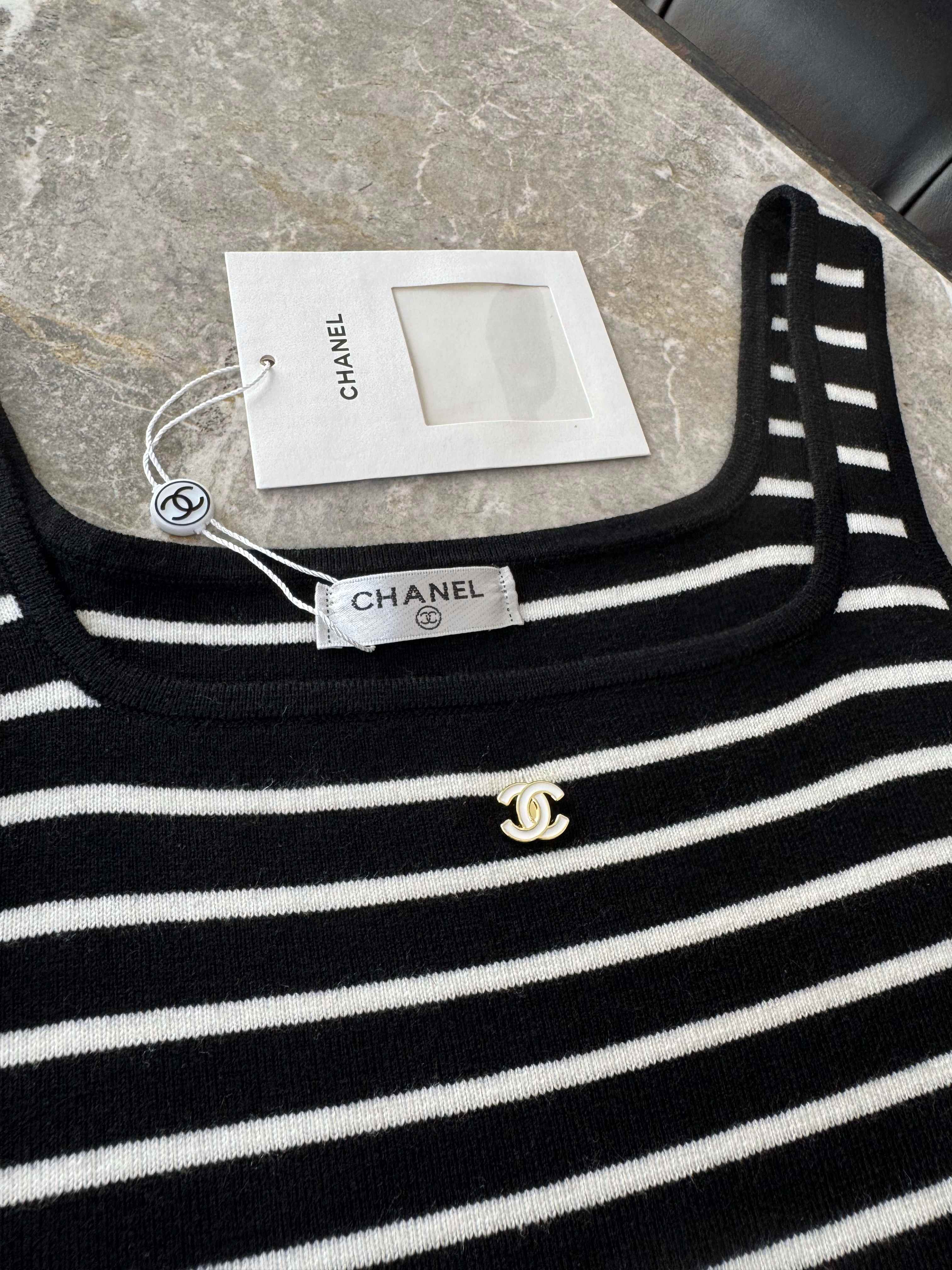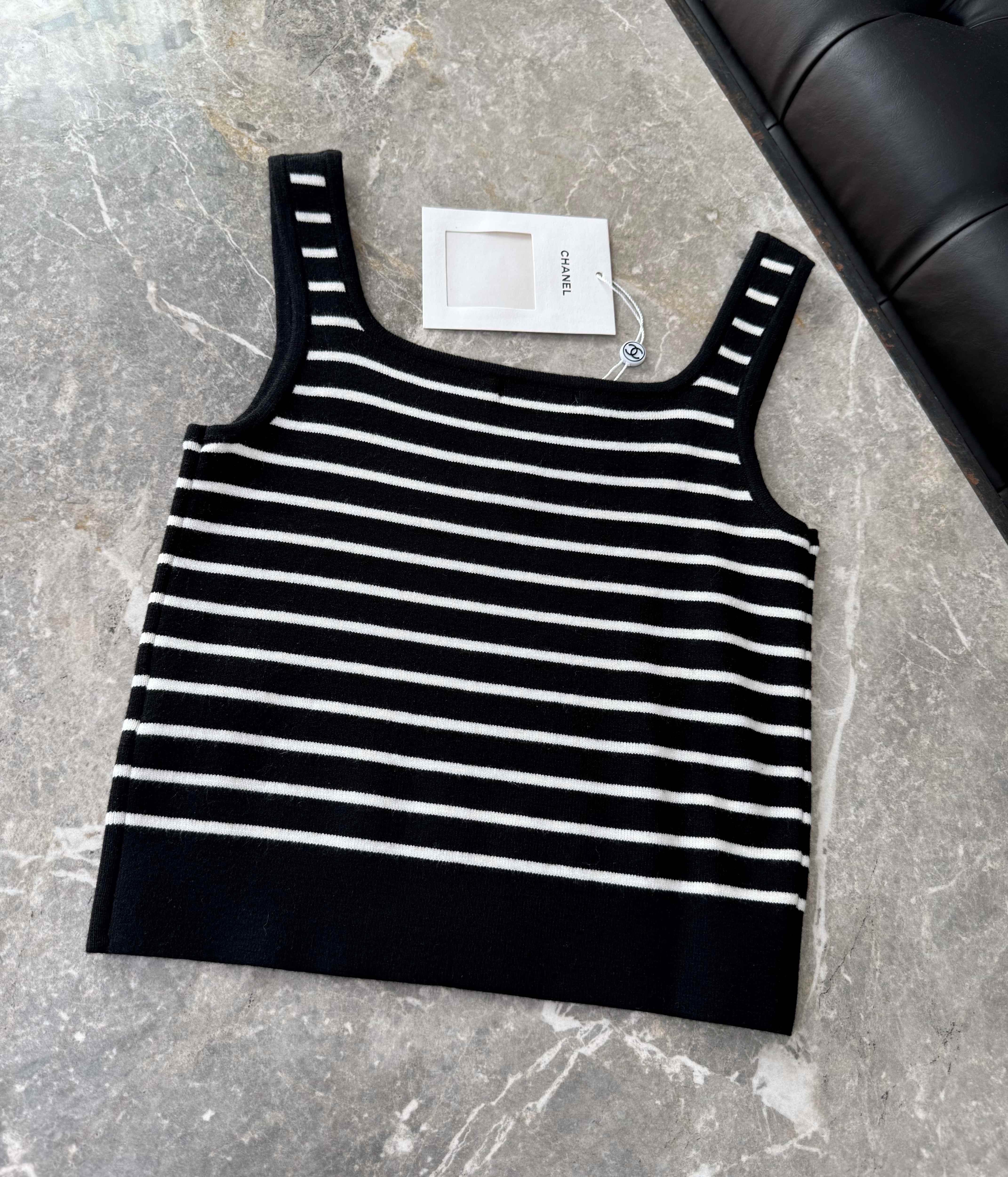 Un básico infalible con impronta icónica. Esta musculosa presenta un diseño rayado en blanco y negro que refleja el ADN atemporal de la maison, combinando elegancia y versatilidad en una sola prenda.