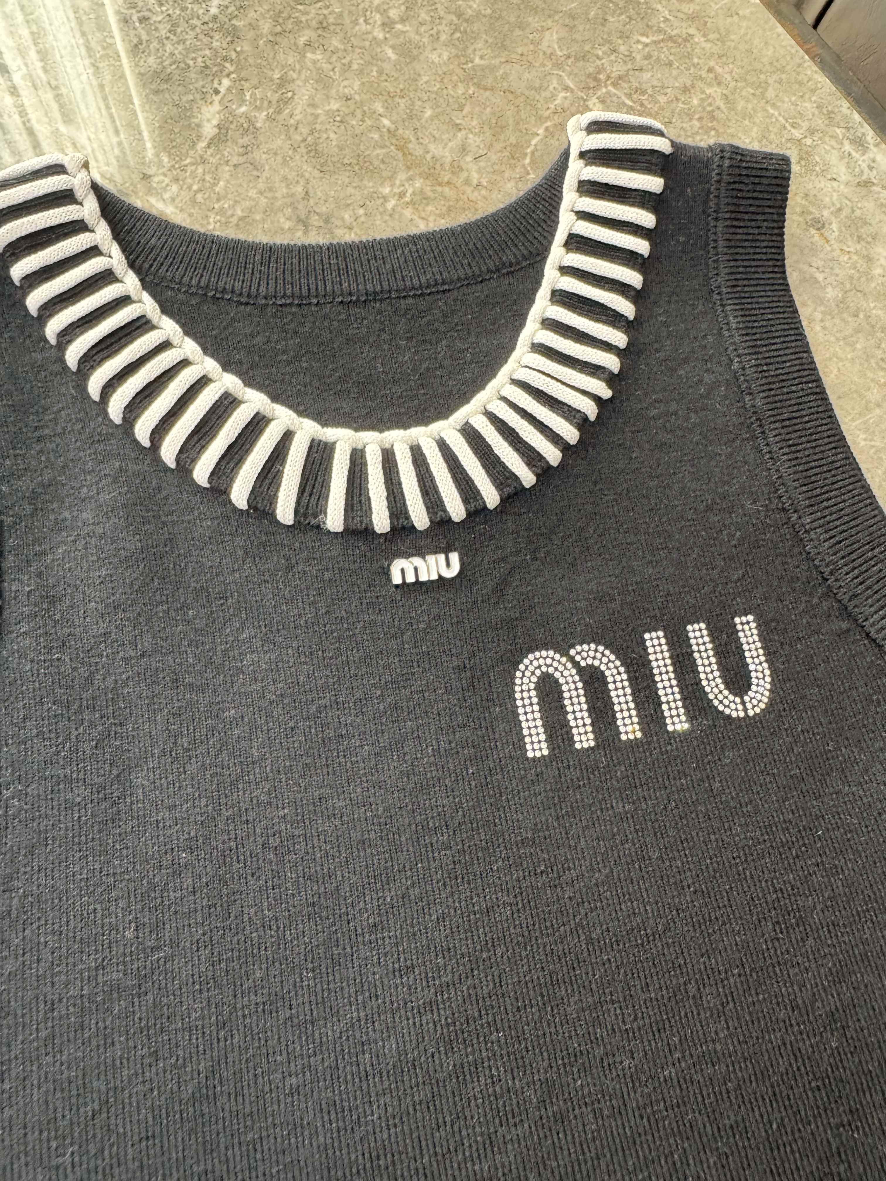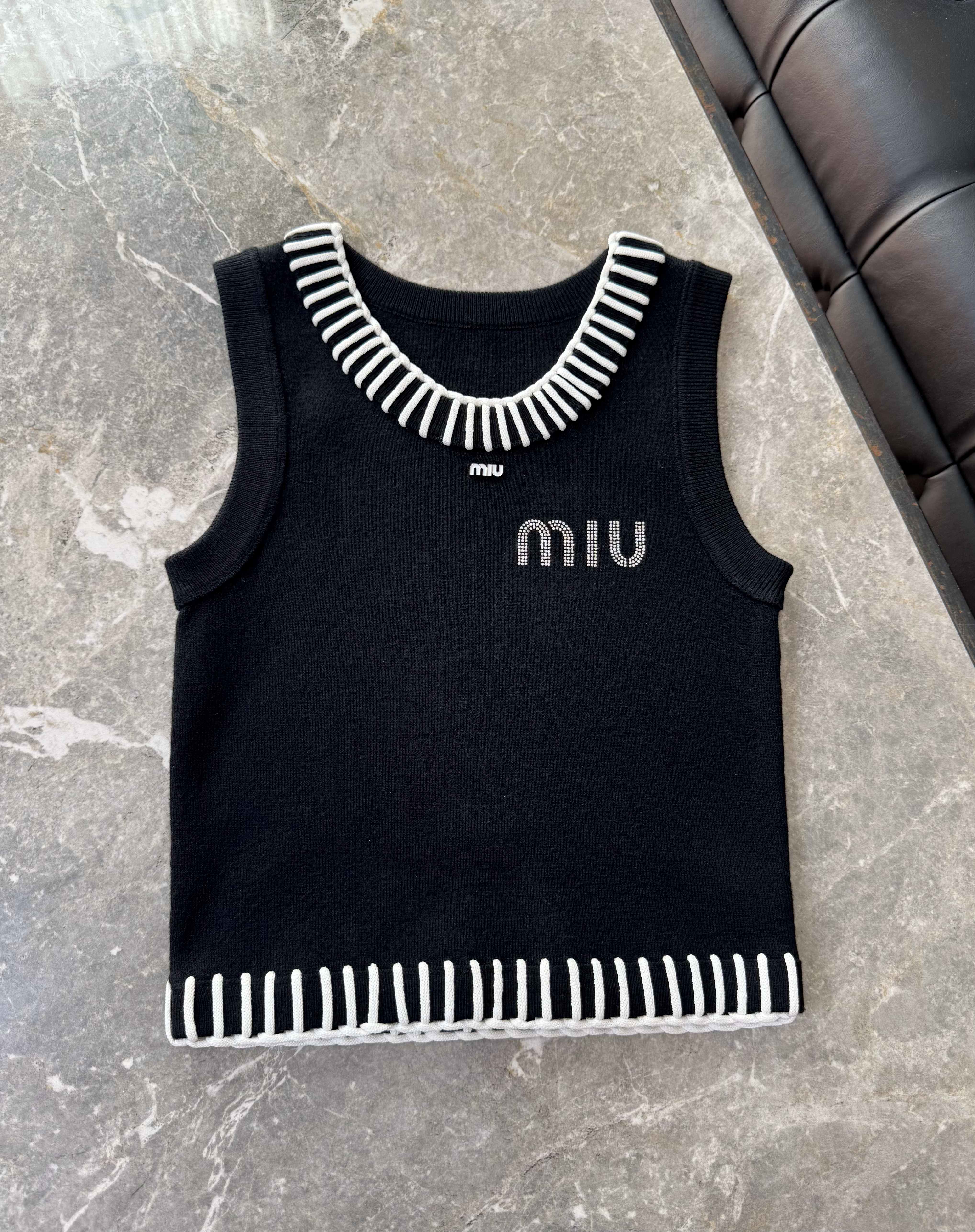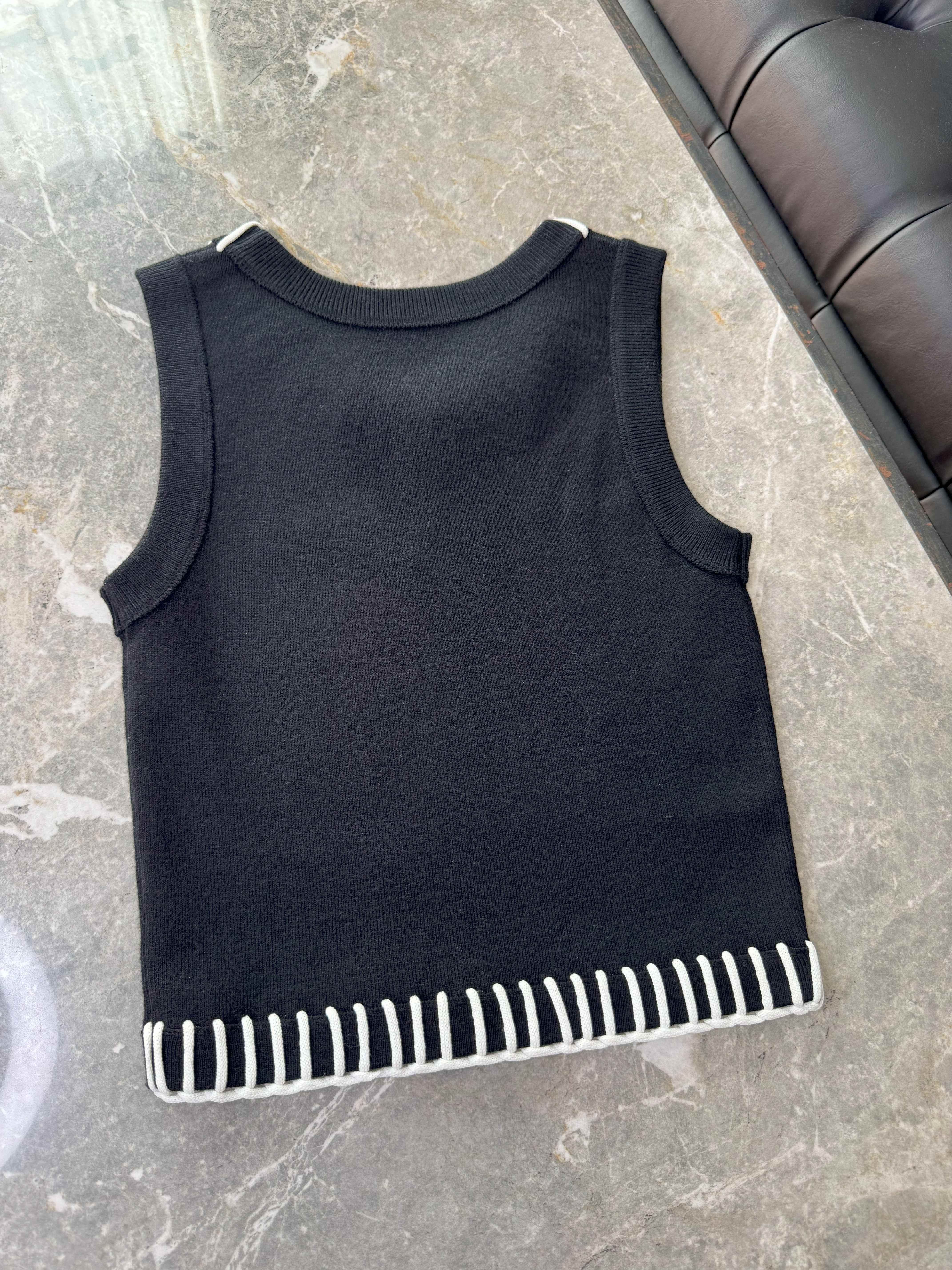 Musculosa sin mangas de diseño minimalista con acento distintivo en los detalles. Confeccionada en tejido de punto fino, presenta una base en negro con terminaciones en hilo blanco tipo soga que recorren el escote y el ruedo, aportando textura y contraste visual.