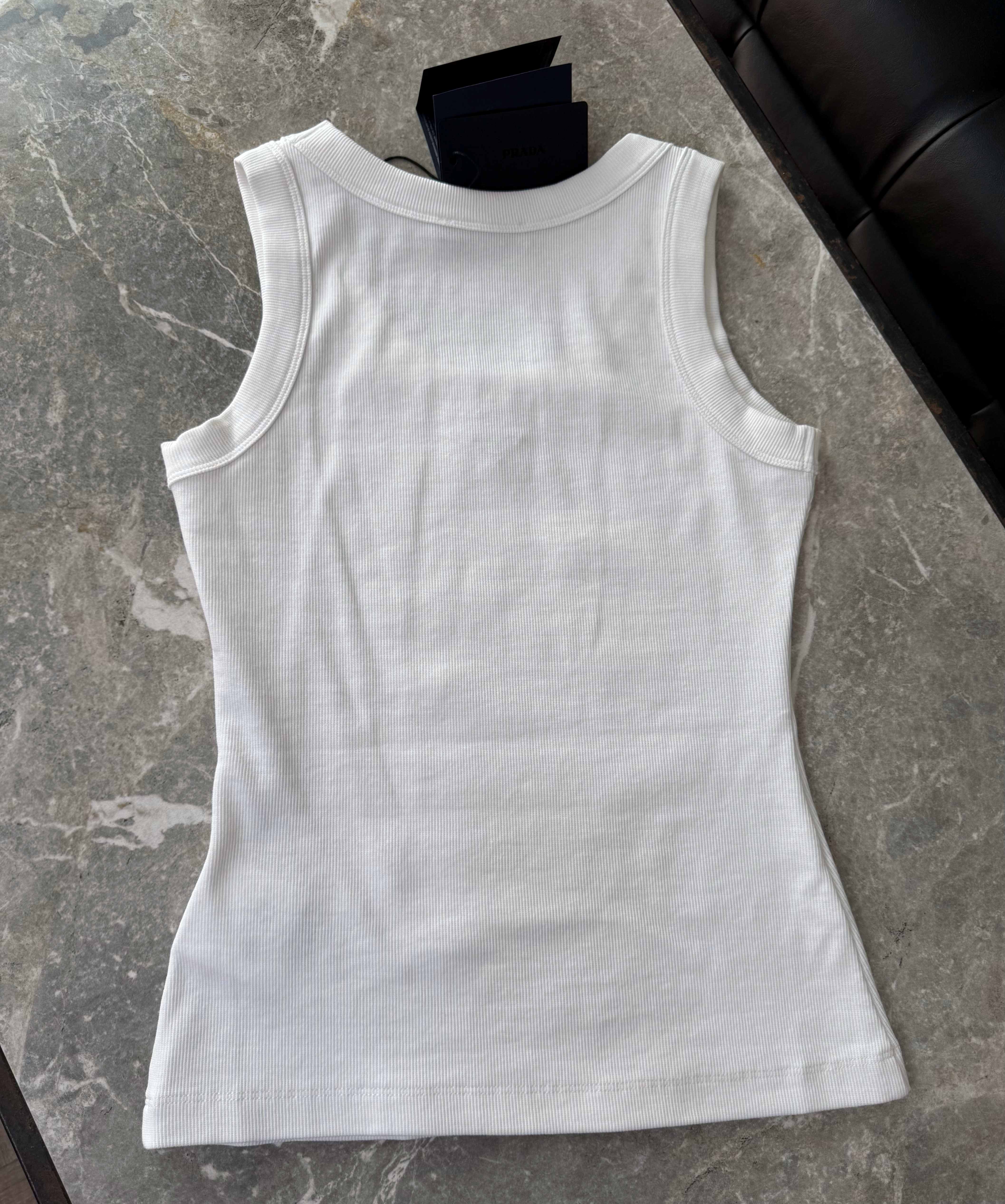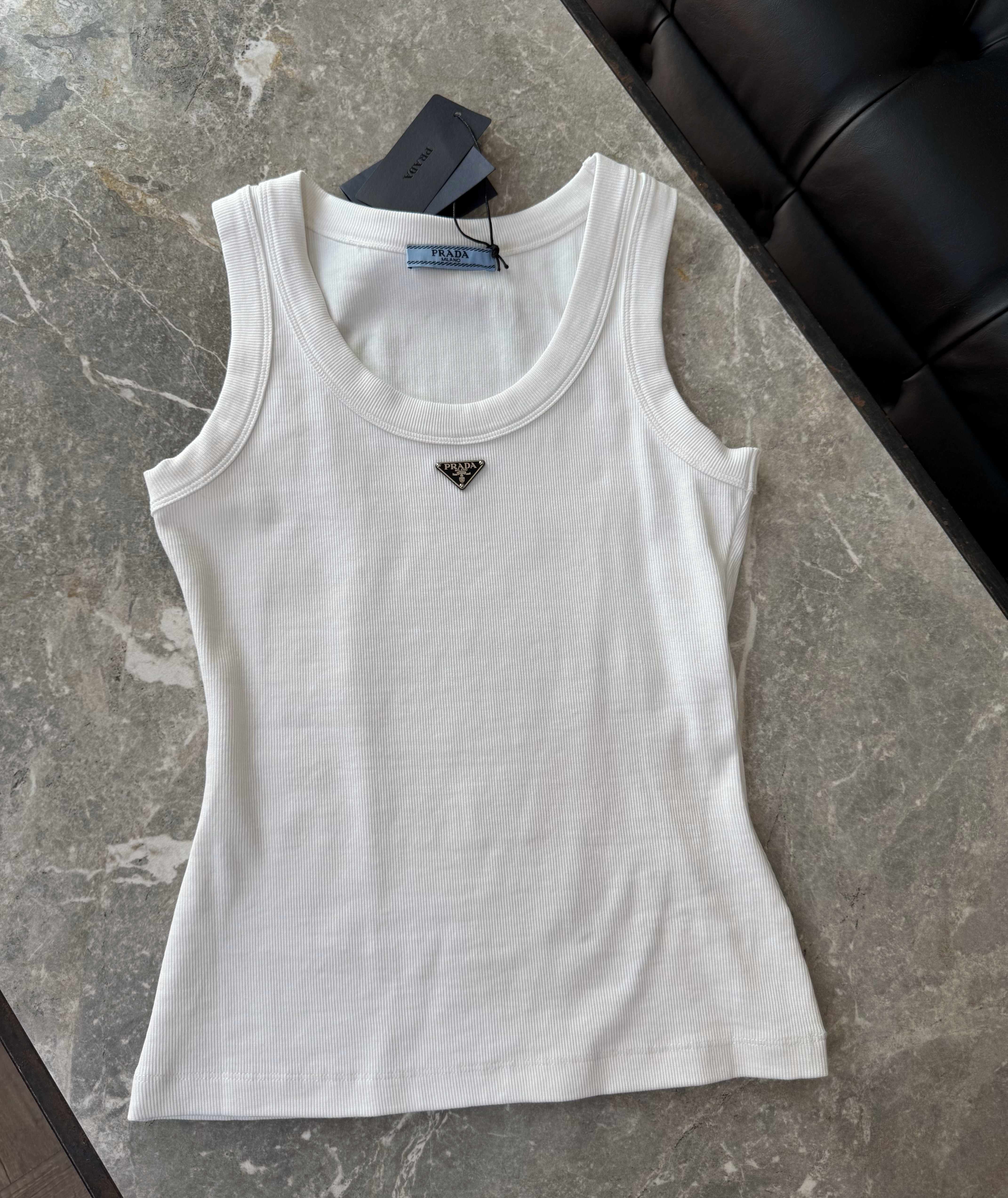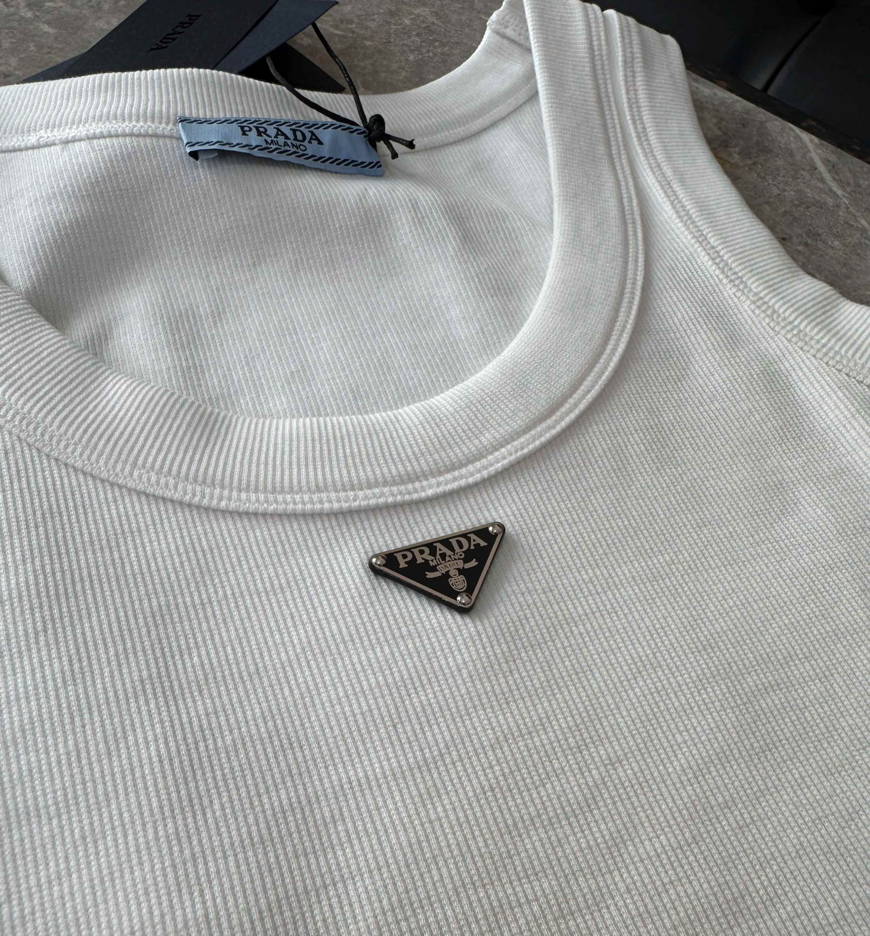 Confeccionada en tejido acanalado suave al tacto, cuenta con escote redondo y el icónico logo triangular metálico aplicado en el frente, aportando un detalle distintivo y sofisticado sin perder simplicidad.