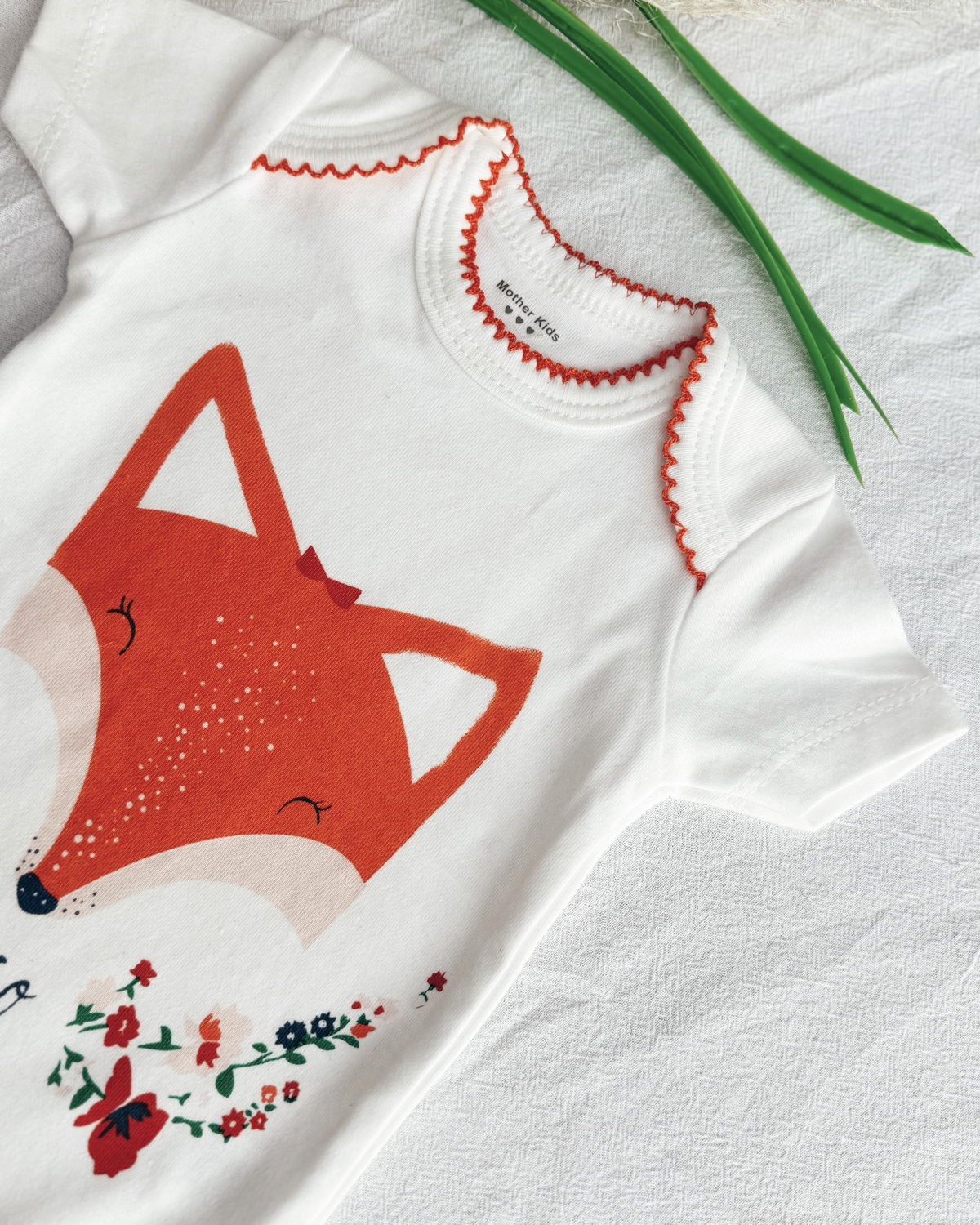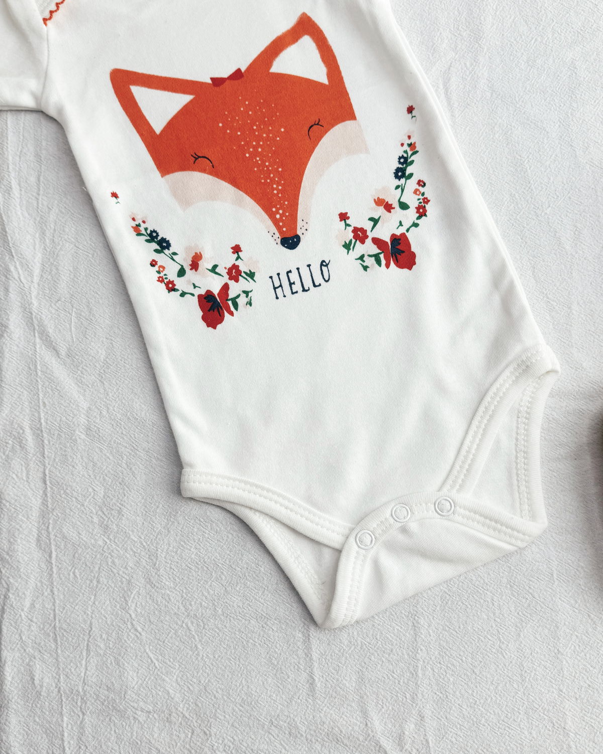 Body m/c en tono blanco tiza con unos volados en el cuello en tono coral tu estampado muy tierno de una zorra bebé, este modelo viene con 3 broches a presión en la parte inferior.