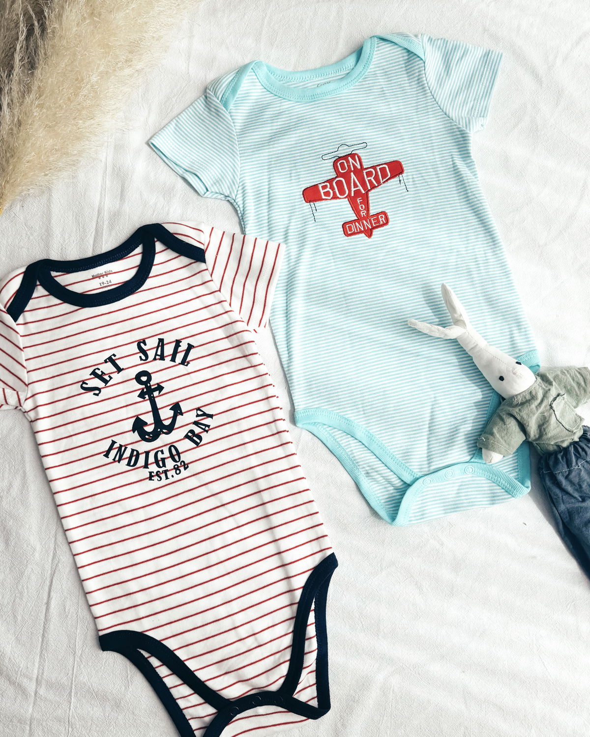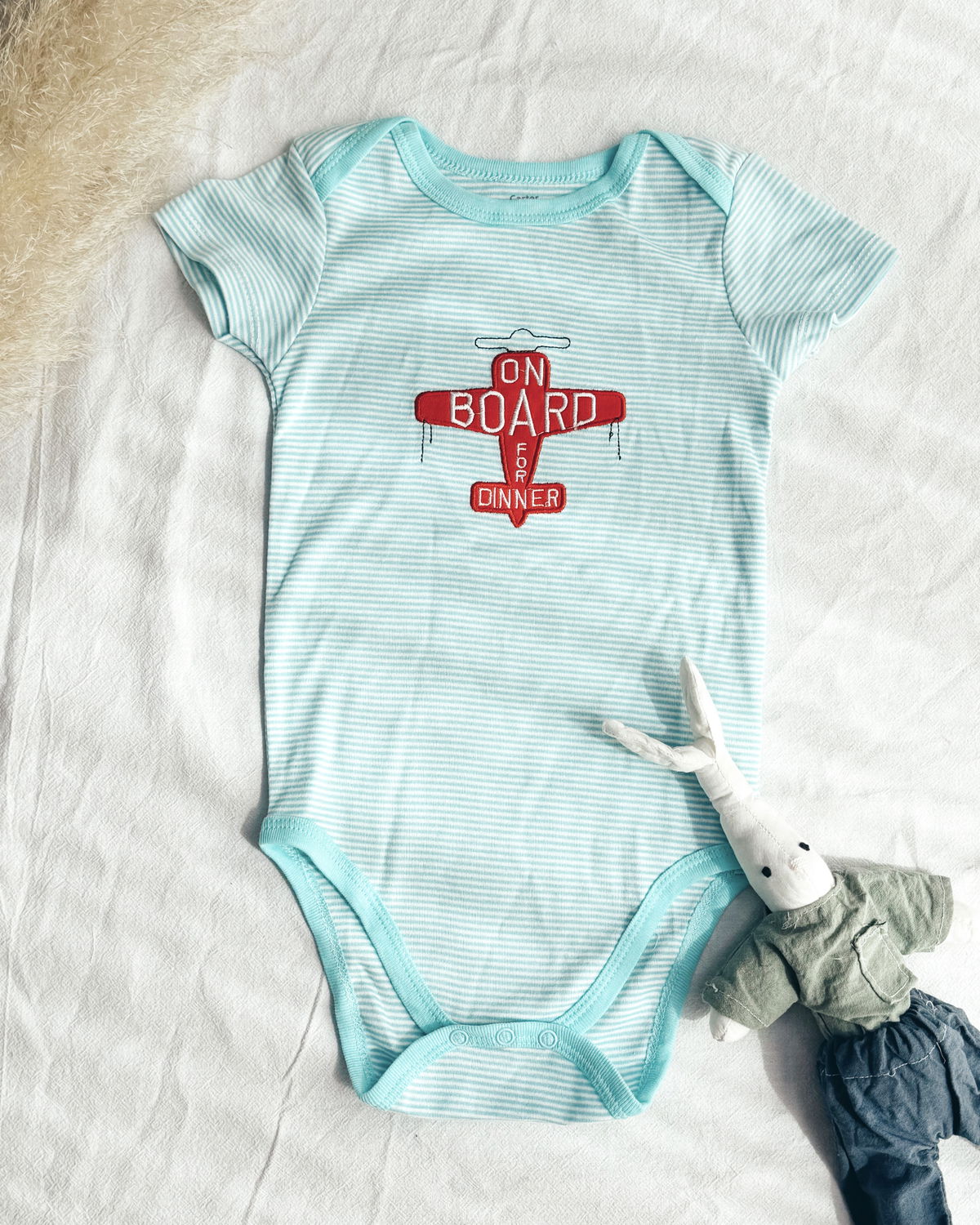 Body m/c con un diseño rayadito de blanco y celeste y un estampado de una avioneta. Este modelo tiene 3 broches en la parte inferior.