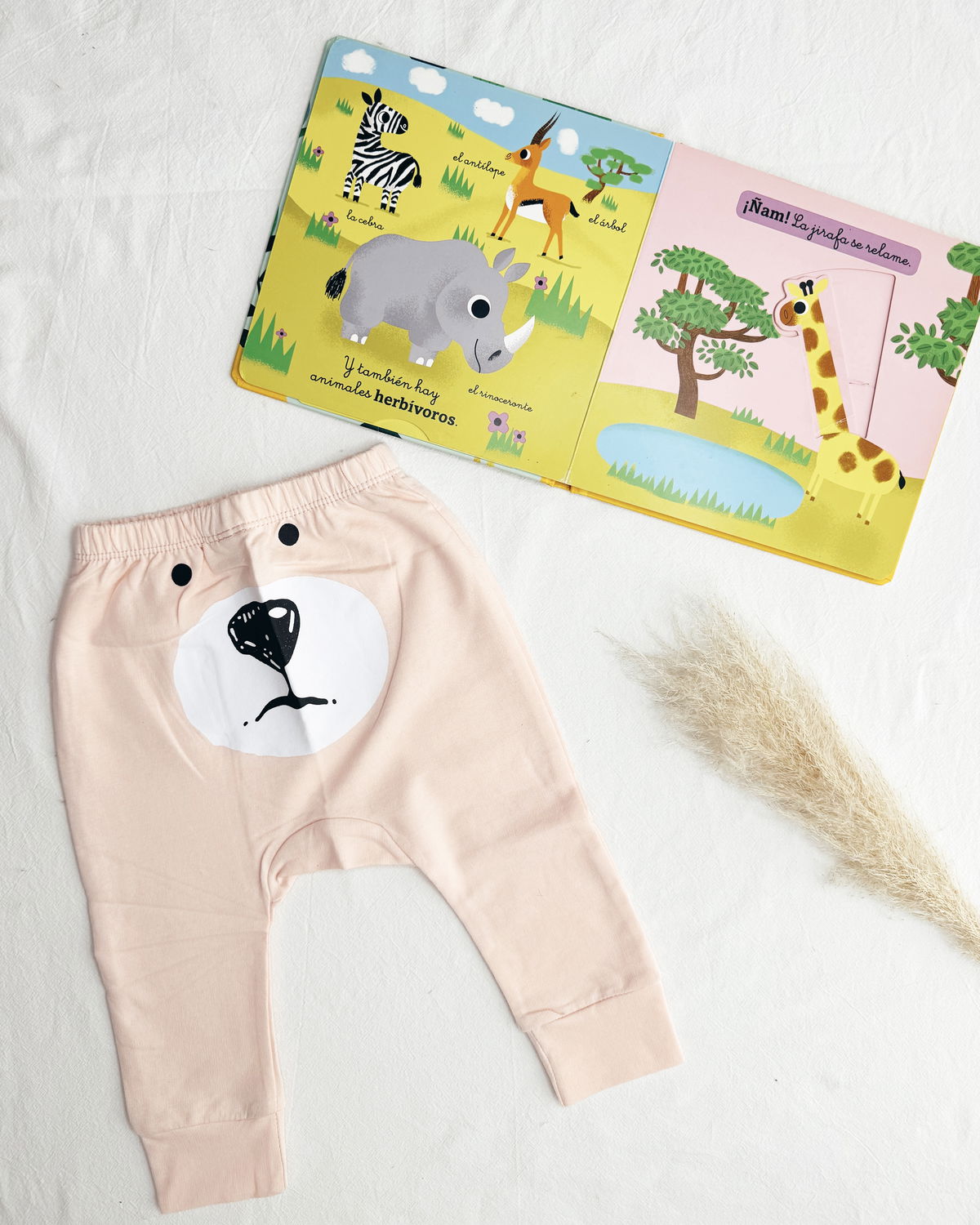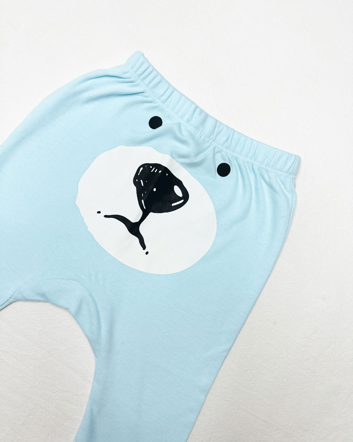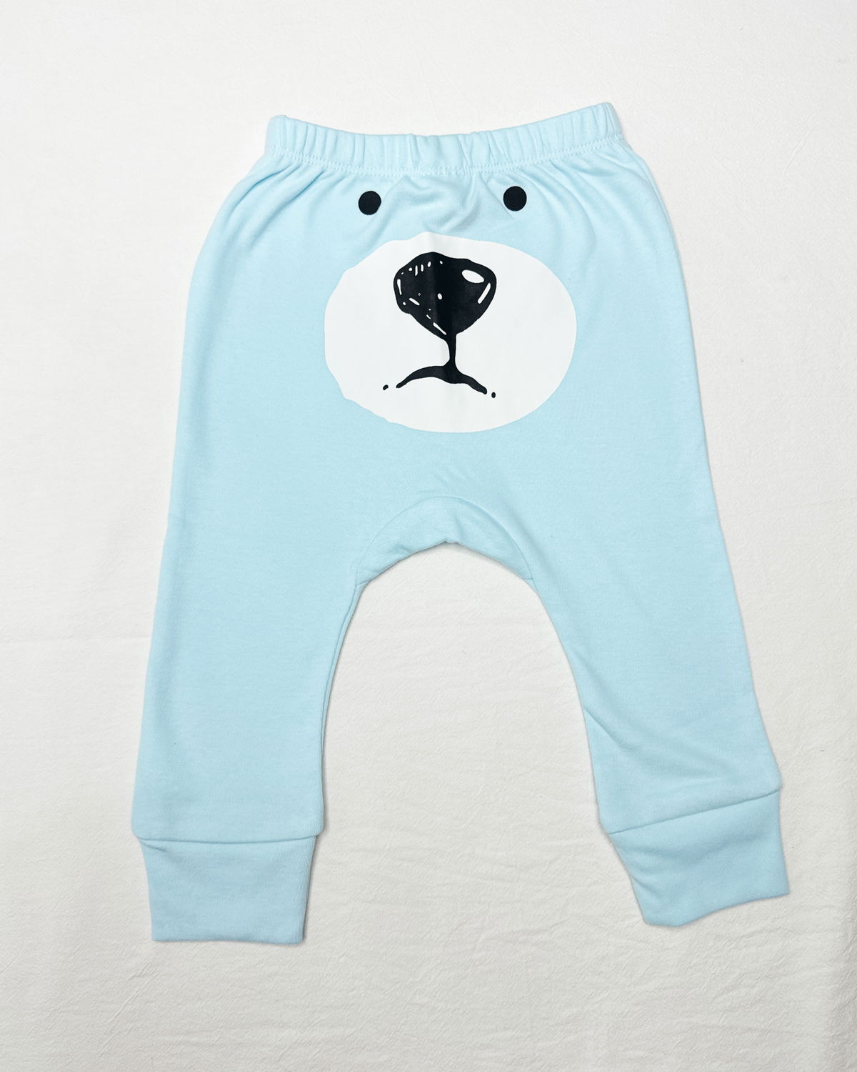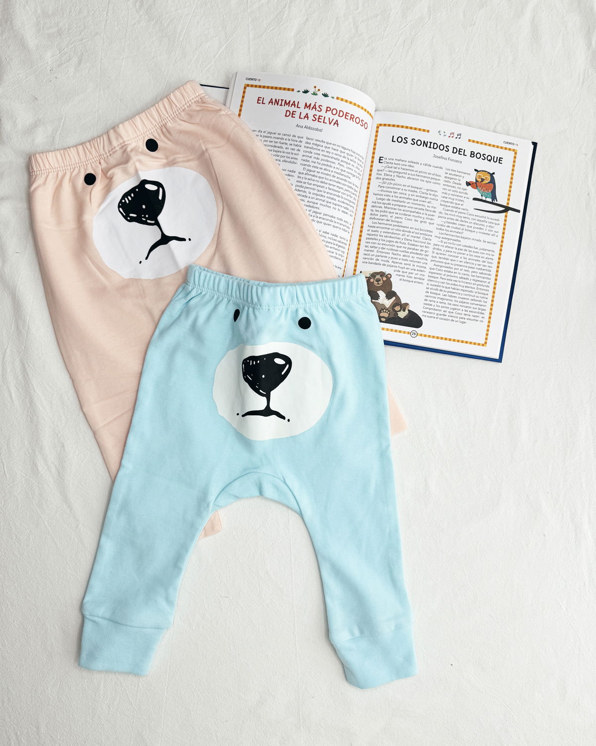 Pantalón de algodón con estampado dn la parte trasera de una carita de osito triste, este hermoso modelo viene en dos colores, rosa y celeste.