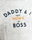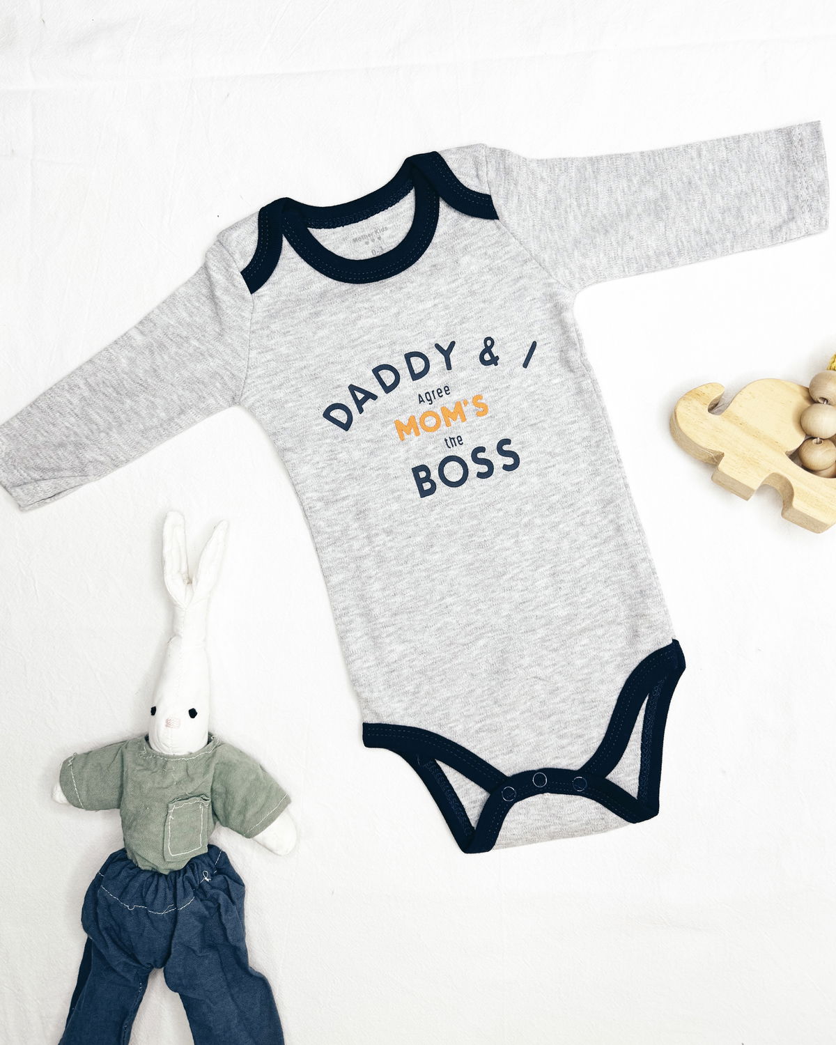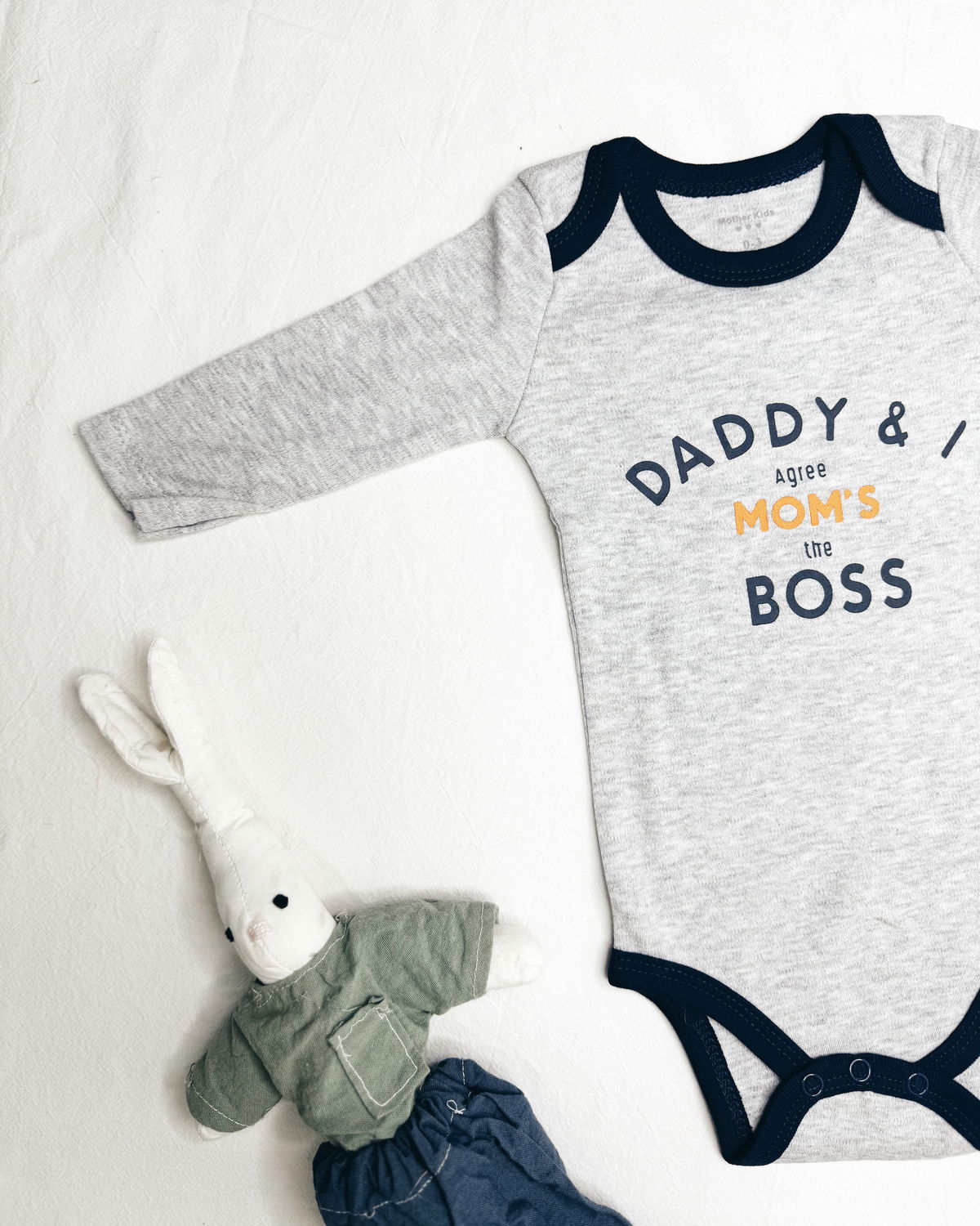 Body m/l en gris gaspeado con detalles en azul oscuro y un estampado en inglés para ponerle un poco de humor donde se traduce " papá y yo estamos de acuerdo en que mamá es la jefa "