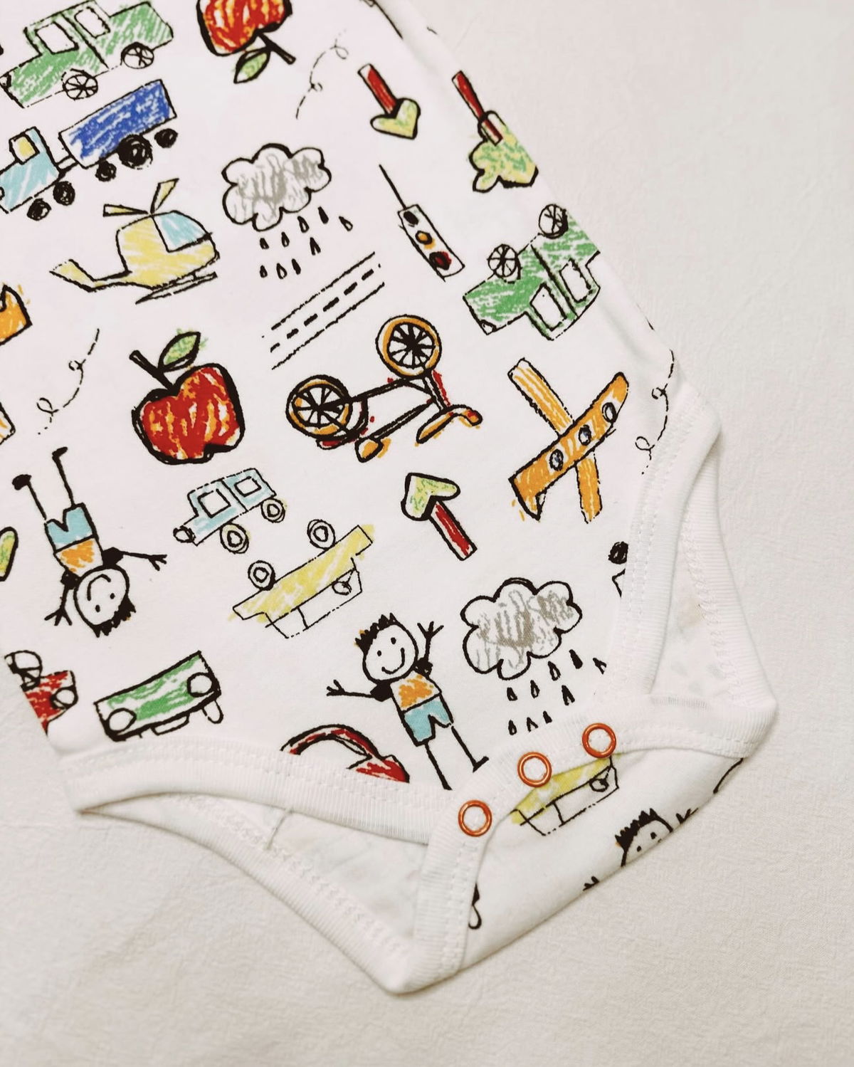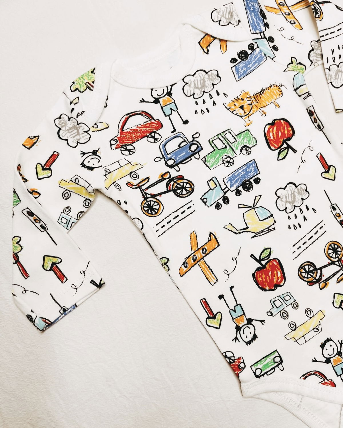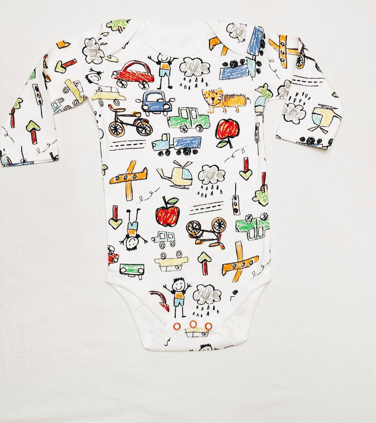 Body m/l en blanco con un estampado muy divertido en donde lo que más se repite son vehículos, semáforos, árboles, dibus tiernos que simulan ser dibujados por algún peque.