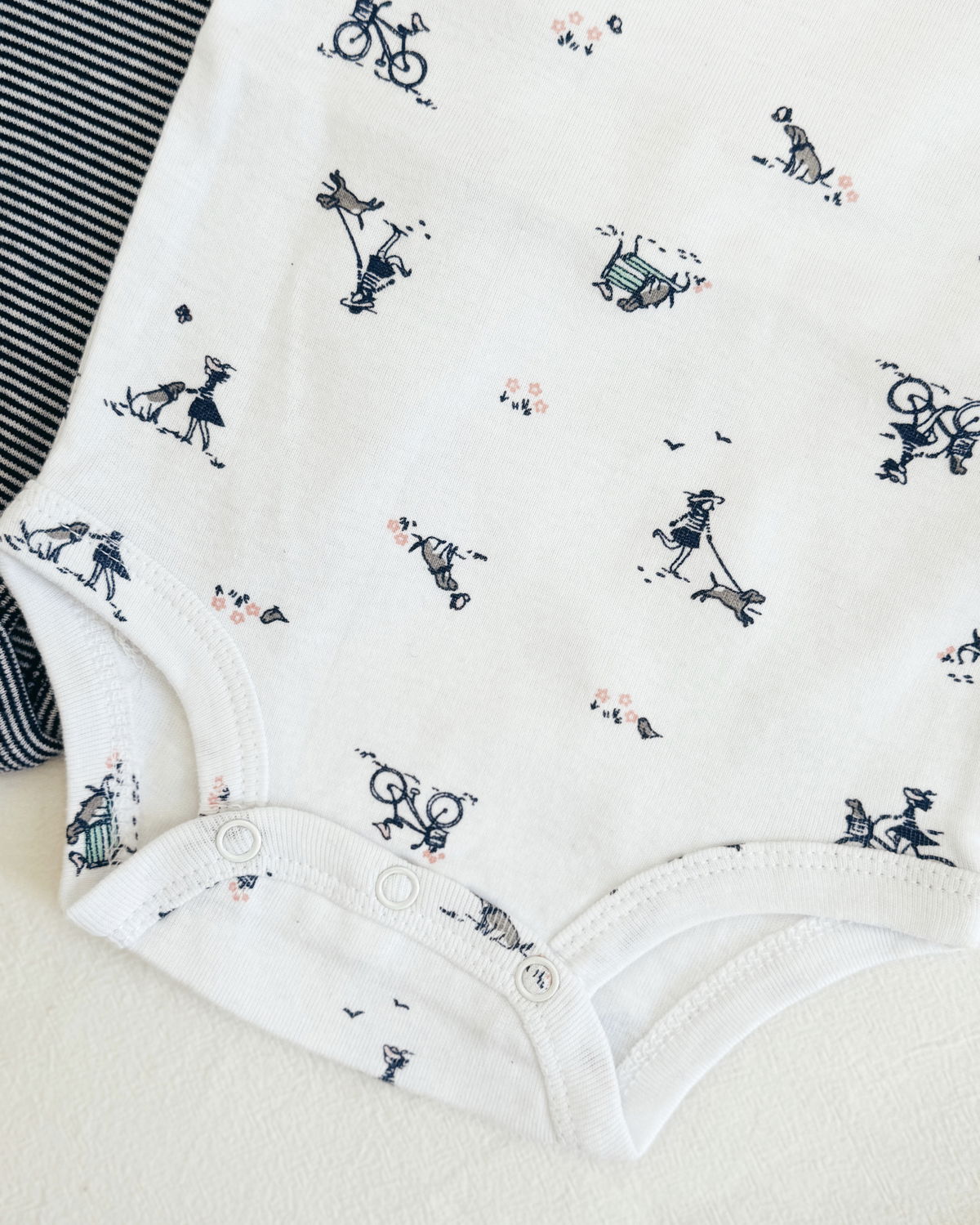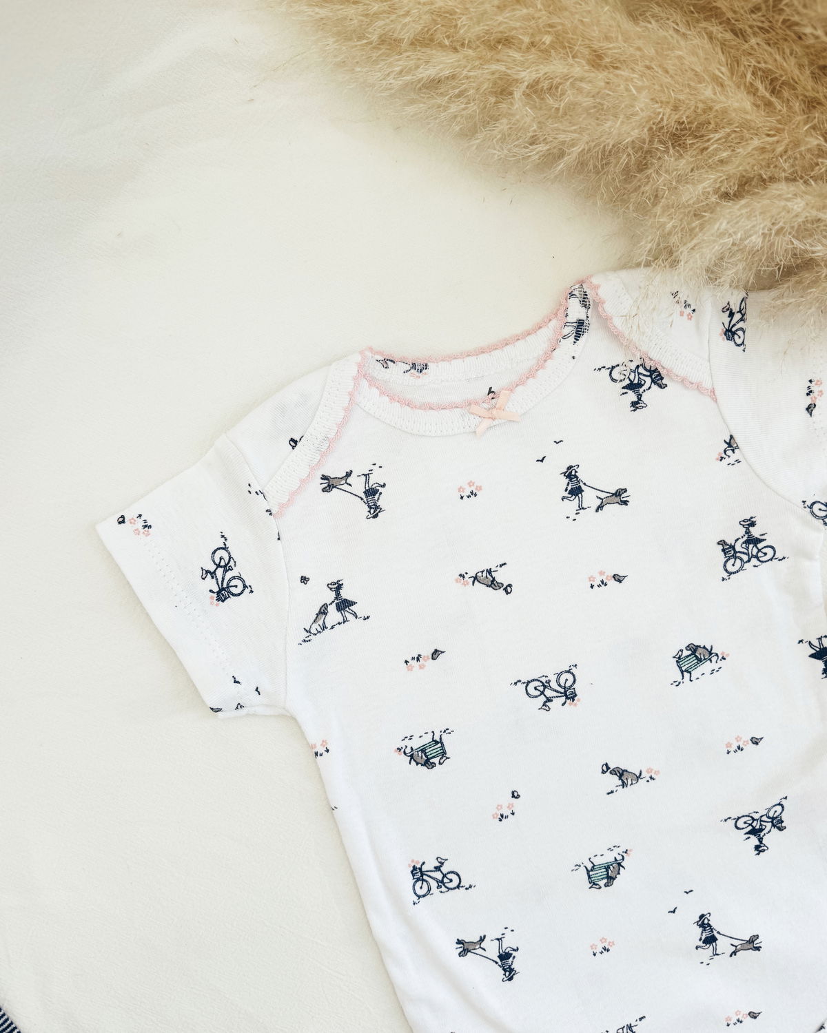 •Body blanco con moño rosa en el cuello y un estampado muy tierno de una nena paseando a su perro, dibujos que le dan mucha ternura al modelo.