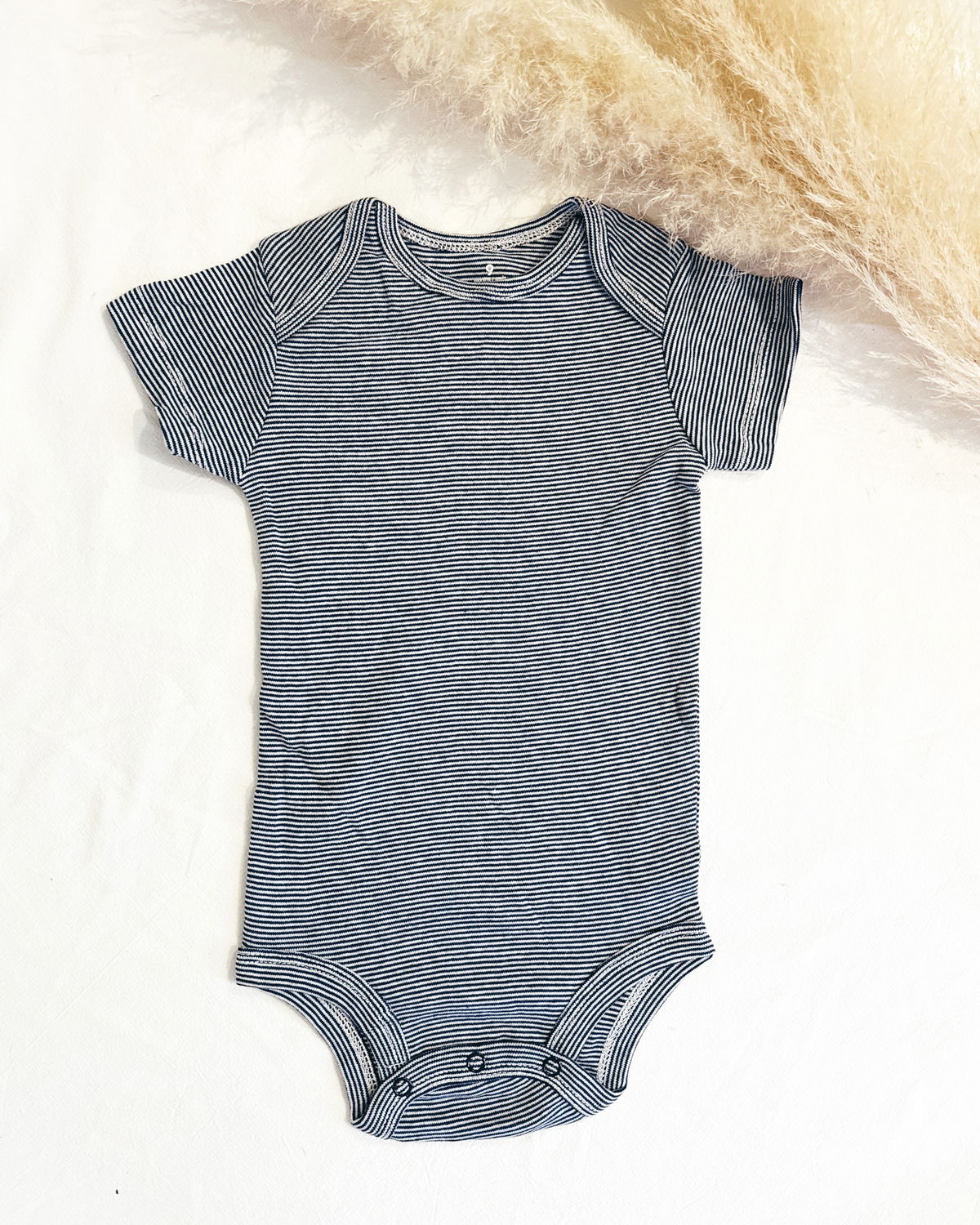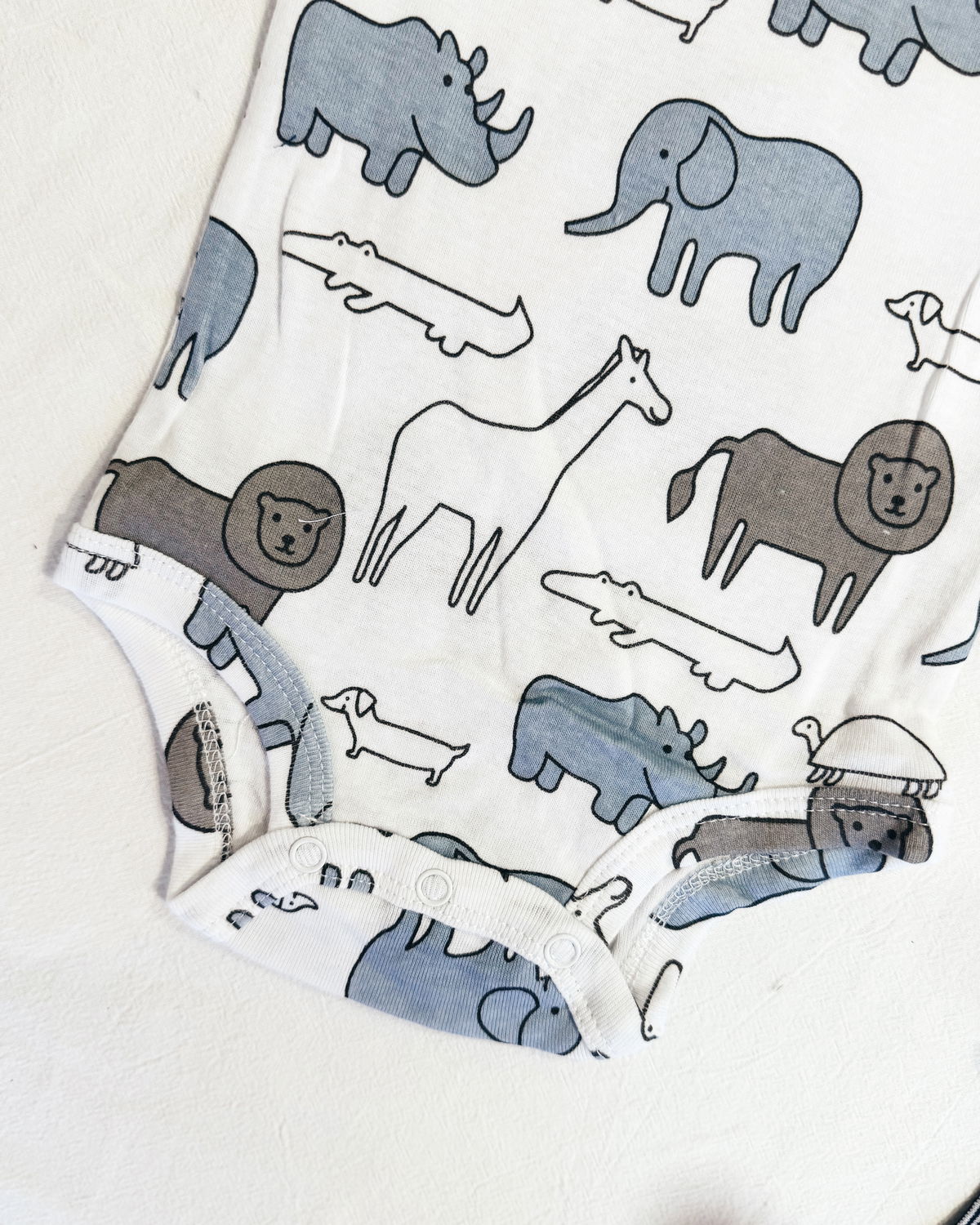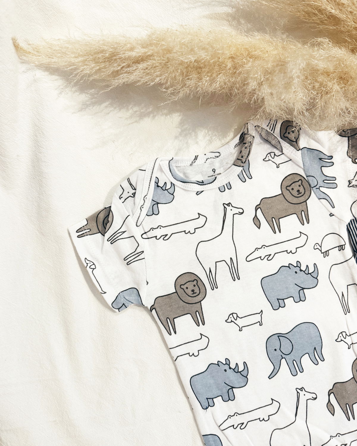 • body en blanco con estampado de animalitos de la selva en tonos grises, celestes y blancos.
