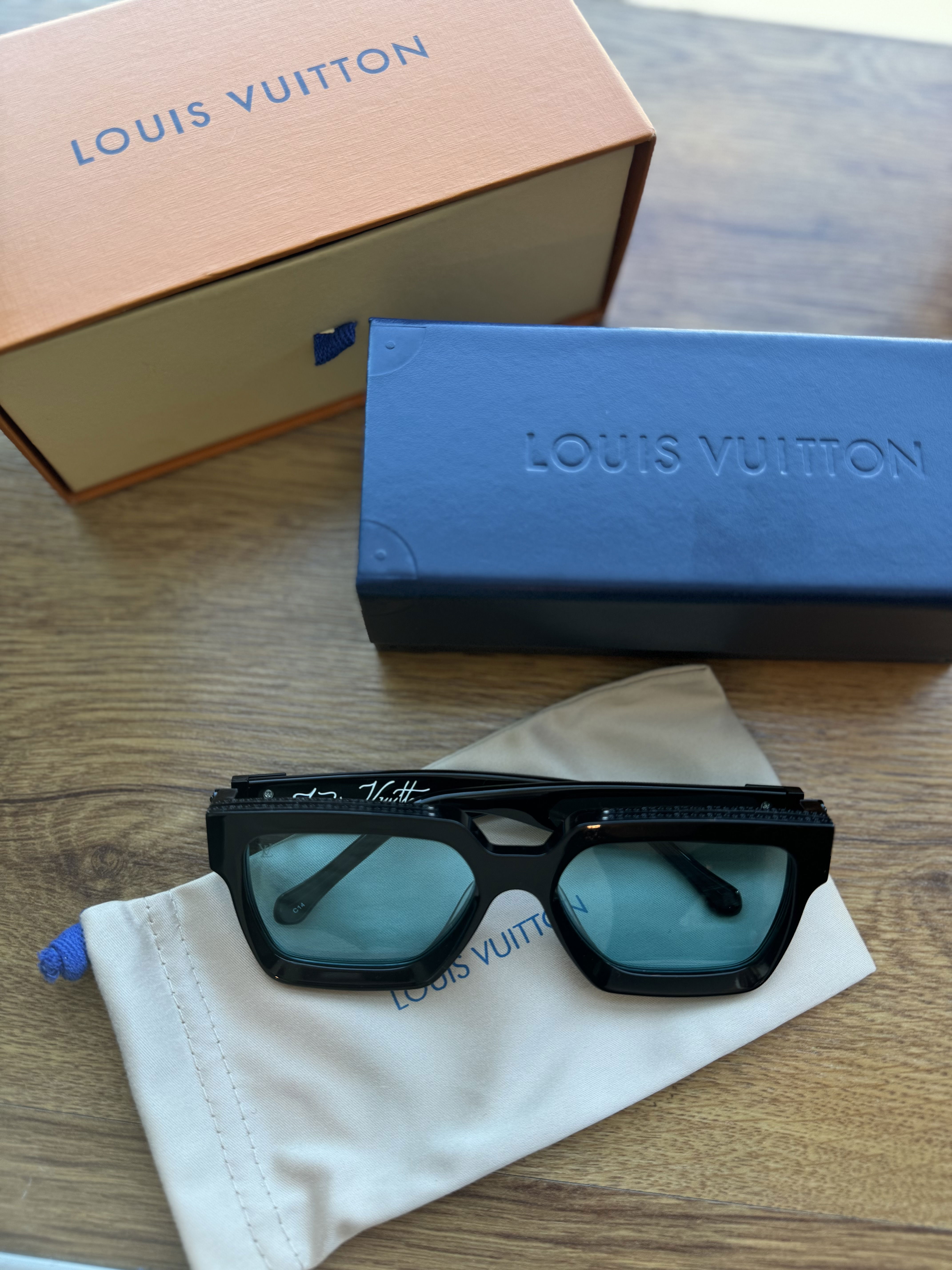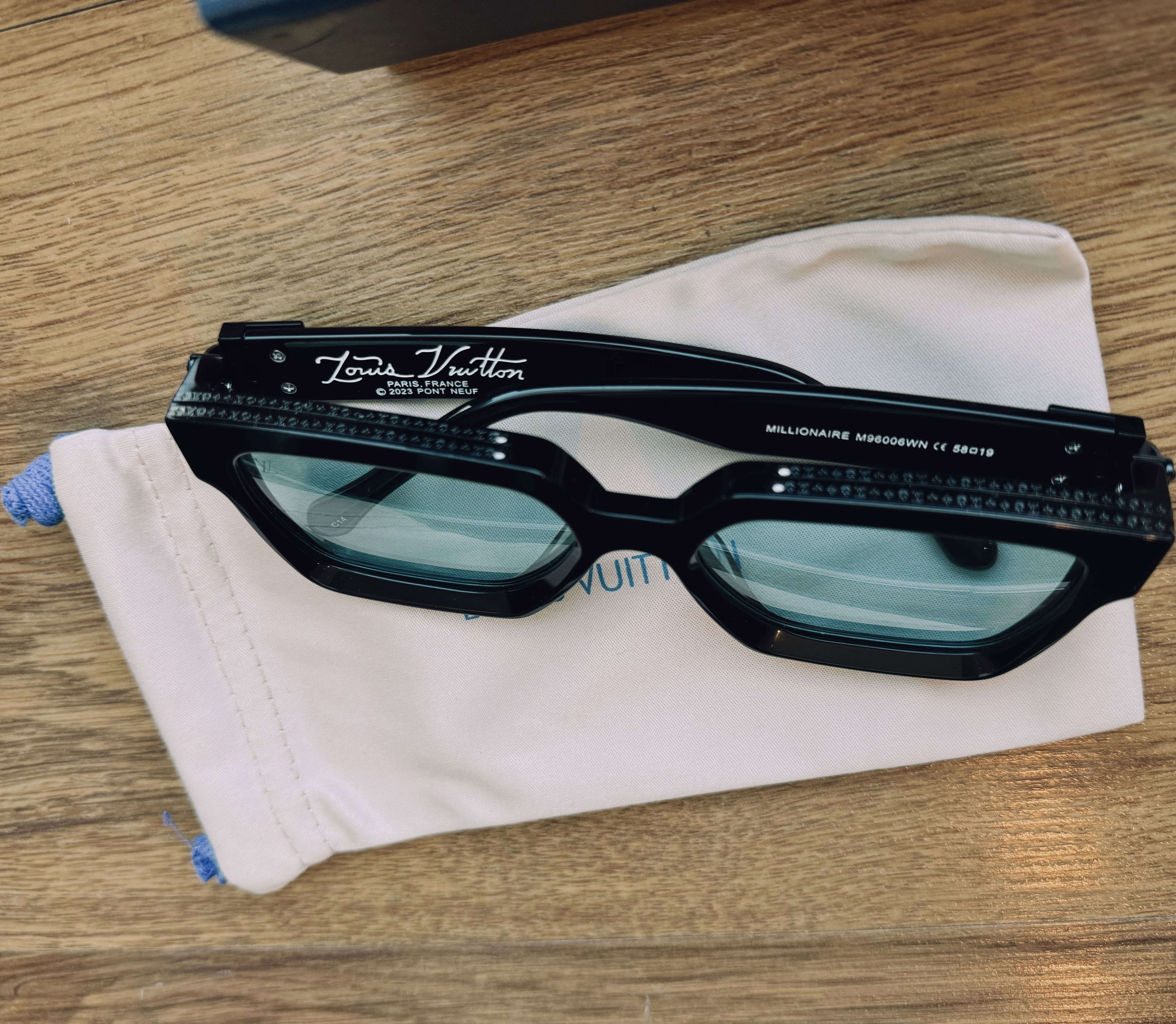 Gafas de Sol negras con lentes en color verde, detalles con monograma en la parte superior.